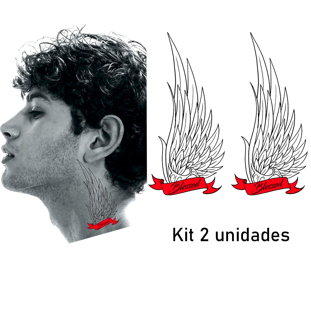 Tatuagem Temporária Blessed Abençoado Asa Rosa Anjo Pescoço