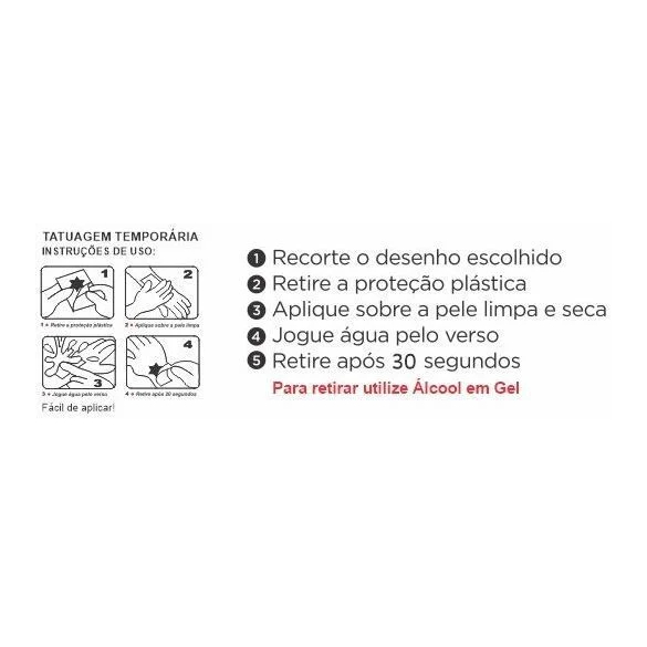 Tatuagem Temporária Infantil BLOCOS cartela com 32 tatuagens certificadas pelo INMETRO MODELOS DISPONÍVEIS: MINECRAFT PRINCESAS DISNEY HERÓIS DE PIJAMA VELOZES E FURIOSOS FROZEN POKEMON NARUTO HEROÍNAS UNICÓRNIO SONIC HERÓIS MARVEL E DC FADAS DISNEY PATRULHA CANINA MARIO BROS PEPPA PIG DINOSSAUROS FUNDO DO MAR BONECAS LOL TOY STORY ANIMAIS FOFINHOS CHUVA DE AMOR MICKEY E MINNIE ENCANTADAS DISNEY CAPIVARAS DIVERTIDAS VARIADAS DENTINHOS DIVERTIDOS SEREIAS MONSTRINHOS Cartela de tatuagem temporária com 32 unidades no tamanho 3x4cm cada (artes 2x3 cm).• Cartela com picote destacável, não é necessária utilização de tesouras.• Coberta com plástico para proteção e conservação da cola. As tatuagens têm validade de 3 anos e devem ser armazenadas em local seco e arejado. Após aplicadas duram até 3 dias, podendo durar menos tempo dependendo da região aplicada e do contato com água/suor. Evitar atrito com a pele no local após aplicado. ANTIALÉRGICAS, ATÓXICAS, REMOVÍVEIS CERTIFICADAS PELO INMETRO MODO DE APLICAR 1- RETIRAR A PROTEÇÃO PLÁSTICA 2 - APLICAR SOBRE A PELE LIMPA E SECA 3 - COM UM ALGODÃO MOLHADO, UMEDECER O VERSO DA TATUAGEM 4 - ESPERE 20 SEGUNDOS E RETIRE CUIDADOSAMENTE O PAPEL