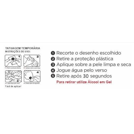 Tatuagem Temporária Infantil Delicadas Disney cartela com 32 tatuagens certificadas pelo INMETRO MODELOS DISPONÍVEIS: MINECRAFT PRINCESAS DISNEY HERÓIS DE PIJAMA VELOZES E FURIOSOS FROZEN POKEMON NARUTO HEROÍNAS UNICÓRNIO SONIC HERÓIS MARVEL E DC STAR WARS FADAS DISNEY PATRULHA CANINA MARIO BROS PEPPA PIG DINOSSAUROS FUNDO DO MAR BONECAS LOL TOY STORY ANIMAIS FOFINHOS CHUVA DE AMOR MICKEY E MINNIE ENCANTADAS DISNEY DELICADAS VARIADAS DENTINHOS DIVERTIDOS SEREIAS MONSTRINHOS Cartela de tatuagem temporária com 32 unidades no tamanho 3x4cm cada (artes 2x3 cm).• Cartela com picote destacável, não é necessária utilização de tesouras.• Coberta com plástico para proteção e conservação da cola. As tatuagens têm validade de 3 anos e devem ser armazenadas em local seco e arejado. Após aplicadas duram até 3 dias, podendo durar menos tempo dependendo da região aplicada e do contato com água/suor. Evitar atrito com a pele no local após aplicado. ANTIALÉRGICAS, ATÓXICAS, REMOVÍVEIS CERTIFICADAS PELO INMETRO MODO DE APLICAR 1- RETIRAR A PROTEÇÃO PLÁSTICA 2 - APLICAR SOBRE A PELE LIMPA E SECA 3 - COM UM ALGODÃO MOLHADO, UMEDECER O VERSO DA TATUAGEM 4 - ESPERE 20 SEGUNDOS E RETIRE CUIDADOSAMENTE O PAPEL