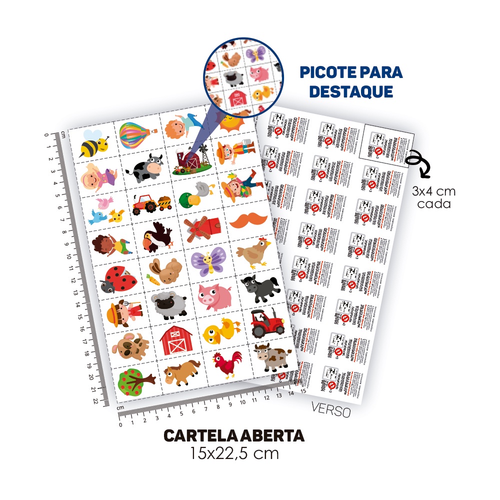 Tatuagem Temporária Infantil | Kit Festa 32-028 | Fazendinha 📌 DESCRIÇÃO DO PRODUTO: ✅ Cartela de tatuagem temporária com 32 unidades no tamanho 3x4cm cada (artes 2x3 cm). ✅ Cartela com picote destacável, não é necessária utilização de tesouras. ✅ Coberta com plástico para proteção e conservação da cola. 📌 INSTRUÇÕES PARA APLICAR A SUA TATUAGEM: 1️⃣ - Destaque o desenho escolhido; 2️⃣ - Retire a proteção plástica; 3️⃣ - Aplique na pele limpa e seca; 4️⃣ - Jogue água pelo verso; 5️⃣ - Retire após 30 segundos. 📌 RECOMENDAÇÕES: ✅ Mantenha fora do alcance de crianças; ✅ Guardar em local fresco e arejado; ✅ Aplique em áreas sem ou com poucos pelos; ✅ Evitar atrito com a tatuagem após aplicado (esperar a cola secar). A Tatuagem Temporária tem validade de 3 anos. Após aplicadas podem durar aproximadamente 3 dias. Produto atóxico PRODUTO TESTADO E CERTIFICADO PELO INMETRO (Disponibilizamos laudos caso necessário) Tatuagem Mania – Mania de Promover Bem! Atuamos no mercado há mais de 20 anos, certificados pelo Inmetro, somos líder em todo o Brasil no segmento de Tatuagens Temporárias. Sempre trazendo inovações, contamos com diversos tipos de acabamentos, sendo eles: cores em neon, metalizadas, que brilham no escuro e/ou na luz negra, realidade aumentada, QR code, resistentes a água, com glitter, aromatizadas e as tradicionais.