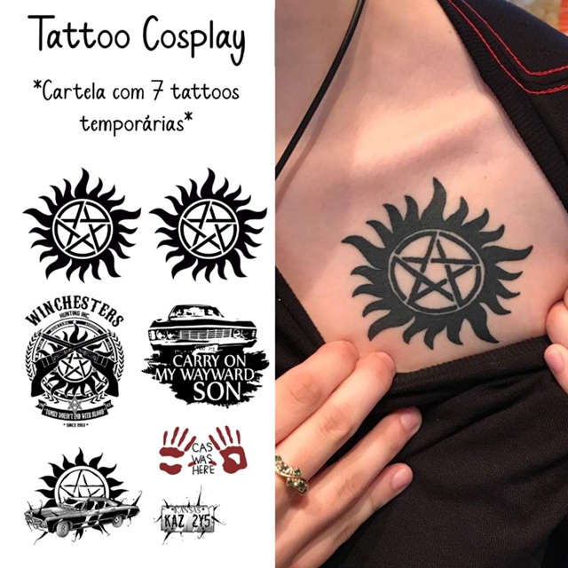 TATUAGEM TEMPORÁRIA SUPERNATURAL SAM WINCHESTER, DEAN WINCHESTER, CASTIEL - Tattoo Para Cosplay 📌 DESCRIÇÃO DO PRODUTO: ✅ Dimensão da cartela: 14x20 cm ✅ Coberta com plástico para proteção e conservação da cola. ✅ Após aplicadas duram até 3 dias, podendo durar menos tempo dependendo da região aplicada e do contato com água/suor. 📌 INSTRUÇÕES PARA APLICAR A SUA TATUAGEM: 1️⃣ - Destaque o desenho escolhido; 2️⃣ - Retire a proteção plástica; 3️⃣ - Aplique na pele limpa e seca; 4️⃣ - Jogue água pelo verso; 5️⃣ - Retire após 30 segundos. 📌 RECOMENDAÇÕES: ✅ Mantenha fora do alcance de crianças; ✅ Guardar em local fresco e arejado; ✅ Aplique em áreas sem ou com poucos pelos; ✅ Evitar atrito com a tatuagem após aplicado (esperar a cola secar). Produto atóxico