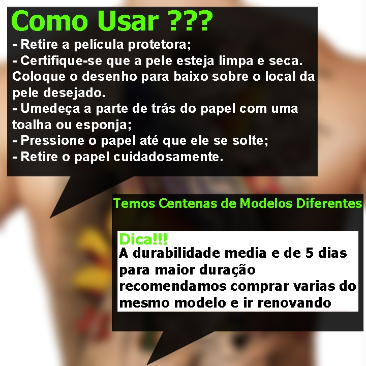 DESCRIÇÃO DO PRODUTO: • Cartela de tatuagem temporária no tamanho 11,5x21cm, a tatuagem têm validade de 3 anos e deve ser armazenada em local seco e arejado.Após aplicada duração media 5 dias, podendo durar menos tempo dependendo da região aplicada e do contato com água/suor.Evitar atrito com a pele no local após aplicado.Recomendamos a aplicação em regiões sem ou com menos pelos. Produto atóxico PRODUTO TESTADO E CERTIFICADO PELO INMETRO Modo de uso: - Retire a película protetora; - Certifique-se que a pele esteja limpa e seca. Coloque o desenho para baixo sobre o local da pele desejado. - Umedeça a parte de trás do papel com uma toalha ou esponja; - Pressione o papel até que ele se solte; - Retire o papel cuidadosamente. • Para remover a tatuagem, basta aplicar um paninho com álcool ou acetona. • Tamanho de cada cartela: 11,5x21cm