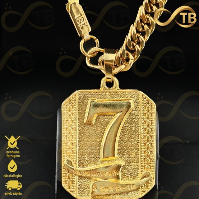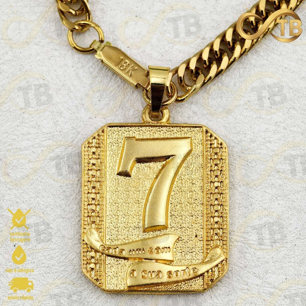 TB Brinquedos Moda Cordão de Moeda Antiga Unissex com Pingente Sorte 7 - Corrente Cadeado Ouro 18K