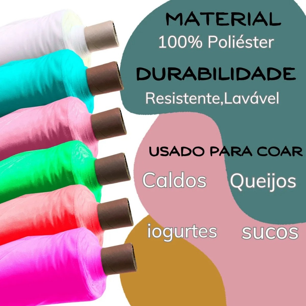 Somos a loja mais tradicional de tecidos do centro Oeste goiano. Com mais de 40 anos no ramo têxtil. Não compre de qualquer um. Compre de quem tem experiência, qualidade e preço baixo. Compre da MB tecidos e decorações. Tecido volta ao mundo. Muito utilizado para espremer queijos, coar sucos e outros líquidos, confecção de cobre lanche entre outros. Largura: 1,50 Composição: 100 % poliamida Cores Variadas OBSERVAÇÕES: 1) No caso de venda de tecidos: a. Estes são vendidos por metro linear com a largura indicada acima. 2) As fotos são produzidas para exibir a cor real do material, podendo ocorrer variação de 10% nos tons dependendo do monitor. 3) Os tecidos são enviados dobrados, se desejar que sejam enviados enrolados, solicite orçamento de transportadora. pelo telefone.. 4) Não efetuamos trocas ou devoluções de vendas de tecidos já cortados com 3 ou menos metros .