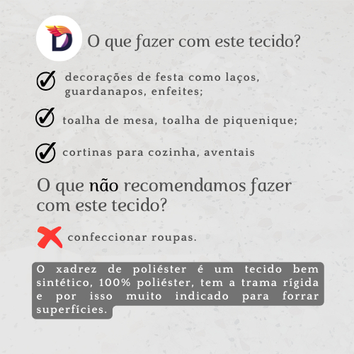 O tergal é um tipo de tecido sintético produzido a partir de fibras de poliéster, conhecido por sua resistência, durabilidade e fácil manutenção. Ele possui uma textura lisa e firme, sendo muito utilizado em decoração, como estofados. O tecido Tergal é apreciado por sua capacidade de manter a forma e resistir ao desgaste do uso constante, além de ser de secagem rápida e de fácil lavagem. A versão xadrez do Tergal é ainda mais popular, trazendo um toque clássico e elegante ao visual. As variações estão em milímetro de acordo com o tamanho do quadradinho do xadrez. PP = 1mm P = 5mm M = 10mm (1cm) G = 20mm (2cm) ORIENTAÇÃO PARA COMPRA: Cada unidade nesse anúncio corresponde 1m x 1,40m (comprimento x largura) 1 unidade = 1m x 1,40m 2 unidades = 2m x 1,40m 3 unidades = 3m x 1,40m 4 unidades = 4m x 1,40m E assim sucessivamente. Na compra de mais de 1 unidade da mesma estampa o tecido será enviado inteiro sem cortes. ATENÇÃO: Podem haver variações de cores devido à imagem reproduzida pela tela do celular ou monitor do computador.