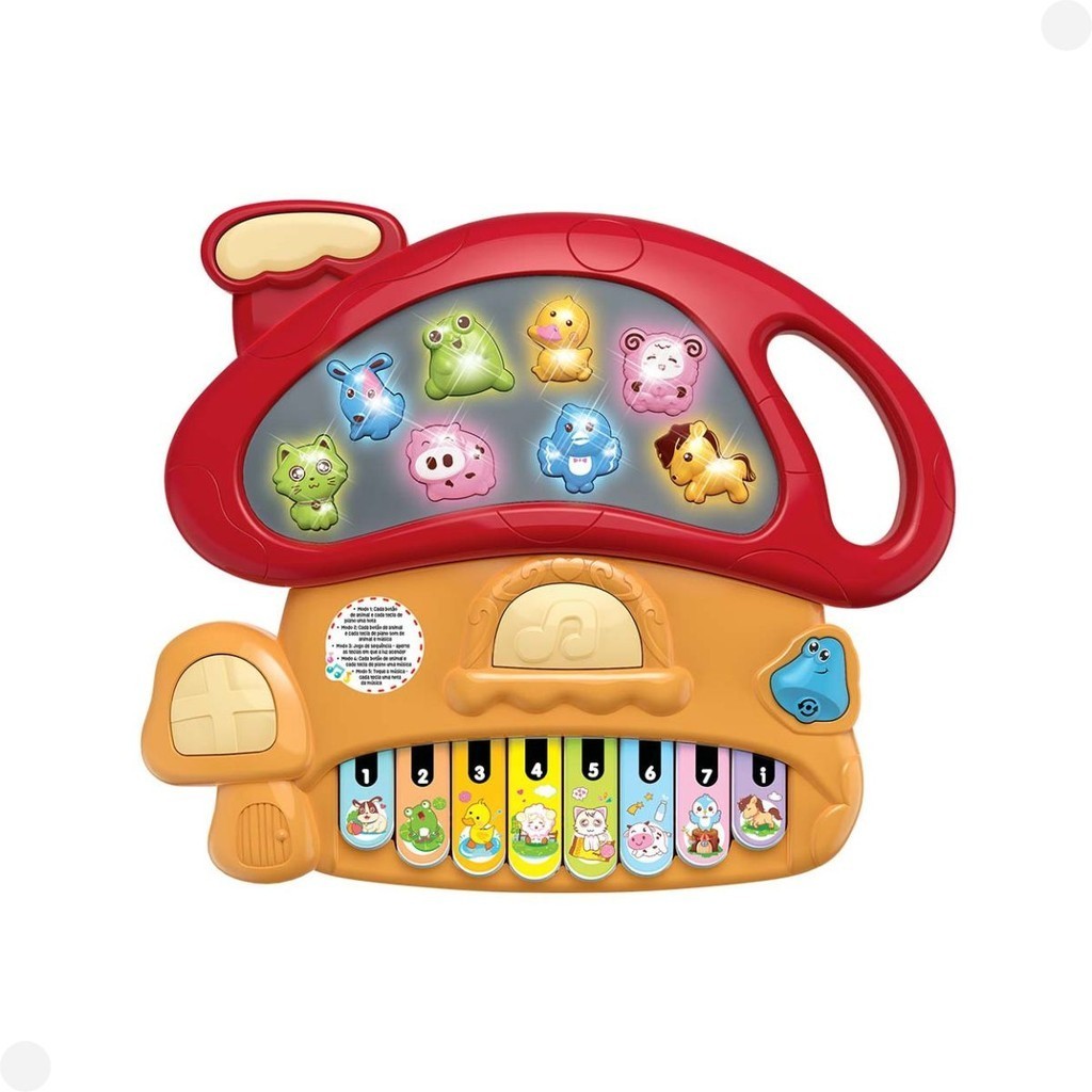 DESCRIÇÃO DO PRODUTO O Teclado Divertido Cogumelo é lindo! Com luz, música e sons de animais, ele tem 5 modos para brincar! Aprenda as notas musicais, os sons dos animais e jogue um jogo de sequencia! CARACTERÍSTICAS TÉCNICAS: Conteúdo da Embalagem: 1 Tecladinho de Brinquedo Dimensões Aproximadas do Produto: 20cm x 24cm x 3cm (Altura x Largura x Comprimento/Profundidade). Dimensões Aproximadas da Embalagem: 29cm x 34cm x 5cm (Altura x Largura x Comprimento/Profundidade). Material/Composição: Plástico Idade Mínima Recomendada: A partir de 3 anos Participantes: A partir de 1 pessoa Alimentação: Não se aplica Marca: DM Toys Referência: COGUMELO DMT6598 PIANO DAS PRINCESAS DMT6599 Outras informações: As cores podem variar entre as imagens mostradas acima e o produto. Imagens meramente ilustrativas. Aviso: As informações e imagens divulgadas são de total responsabilidade do fabricante/fornecedor. Produto lacrado e disponível a pronta entrega para todo Brasil! APROVADO PELO INMETRO