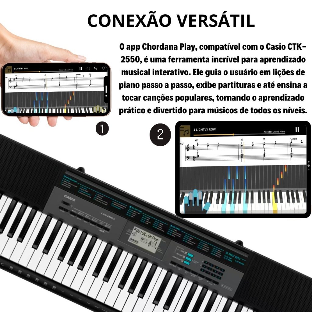 O teclado musical Casio CTK 2550 é ideal para quem busca qualidade sonora, facilidade de aprendizado e muita versatilidade. Com 61 teclas estilo piano e resposta ao toque, oferece variação natural de volume e dinâmica conforme a força aplicada nas teclas. Conta com 400 timbres de alta qualidade e 100 ritmos com auto acompanhamento, incluindo ritmos latinos e estilos do mundo todo. O Modo Dance Music permite criar músicas eletrônicas de forma simples e divertida, adicionando efeitos sonoros e frases rítmicas com apenas alguns toques. Possui efeitos digitais de reverberação, sistema de lições integradas, metrônomo e compatibilidade com o aplicativo Chordana Play, que facilita o aprendizado com recursos visuais e interativos em dispositivos inteligentes. Leve, compacto e portátil, pode ser alimentado por pilhas AA ou fonte, sendo ideal para estudo, apresentações, prática diária e uso em qualquer ambiente. ESPECIFICAÇÕES TÉCNICAS Marca: Casio Modelo: CTK2550 Teclas: 61 teclas estilo piano com resposta ao toque Polifonia: 48 notas Timbres: 400 Ritmos: 100 com auto acompanhamento Músicas integradas: 60 Efeitos: Reverberação com 10 tipos Modo Dance Music Sistema de lições Dedilhado em áudio Sistema de pontuação Conectividade: Compatível com aplicativo Chordana Play Acompanha fonte