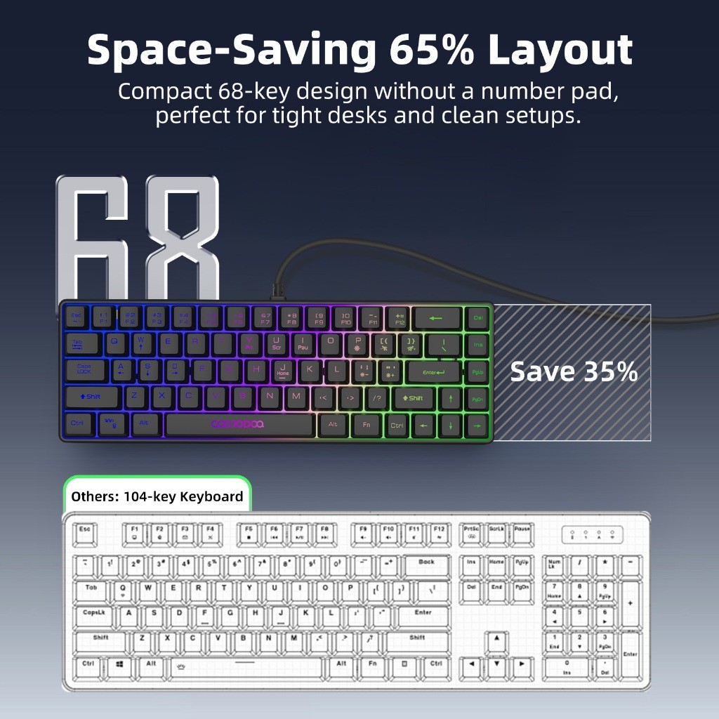 1. Desempenho ultraestável para jogos com fio: Desfrute de entrada altamente responsiva e da conveniência plug-and-play. Equipado com um cabo USB anti-interferência de 1,6 m, este teclado com fio oferece uma conexão estável e sem travamentos para jogos ininterruptos. Possui durabilidade de 10 milhões de pressionamentos de tecla, suporte anti-ghosting para 19 teclas e função de bloqueio de teclas Win (FN+Win) para evitar interrupções acidentais durante jogos intensos. 2. Layout compacto de 68 teclas: Este layout de 68 teclas equilibra perfeitamente funcionalidade e tamanho. Ao reduzir a área do teclado numérico, este miniteclado economiza 35% do valioso espaço da mesa em comparação com teclados de 108 teclas, mantendo todas as teclas essenciais para jogos e tarefas diárias. Quatro almofadas de borracha antiderrapantes mantêm o teclado no lugar. 3. Retroiluminação RGB com controles personalizados: Digite e jogue sem esforço no escuro. A retroiluminação transparente permite que o teclado gamer de 7 cores brilhe. Escolha entre os modos de iluminação sempre ligado, respiração ou desligado usando FN+P, ajuste o brilho com FN+*/- e controle a velocidade da respiração com FN+]/[. 4. Design ergonômico com toque mecânico: Projetado com uma superfície de teclado curva para se ajustar à palma da mão e uma altura de tecla de 39 mm para reduzir a tensão no pulso, o teclado mecânico oferece conforto duradouro para uso prolongado e de alta intensidade. Além disso, a estrutura altamente elástica garante um retorno rápido e preciso a cada toque, tornando a digitação confortável e aliviando o estresse. 5. Ampla compatibilidade entre sistemas: Não precisa se preocupar com limitações do sistema. Este teclado compacto funciona perfeitamente com Windows 98/XP/2000/ME/Vista/7/8/10, Linux, Android e iOS — perfeito para usuários com uma variedade de dispositivos ou plataformas.