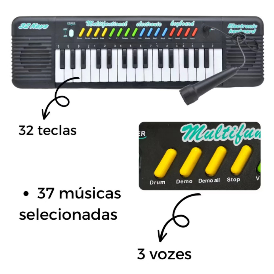 Teclado Infantil com Microfone – 32 Teclas, Piano Musical Educativo com Função Karaokê (Preto) – Brinquedo Musical (3+) Desperte o talento musical desde cedo com o Teclado Infantil com Microfone! Com 32 teclas e função karaokê, este brinquedo vai muito além da diversão: ele contribui diretamente para o desenvolvimento sensorial, auditivo e motor das crianças. Ideal para pequenos músicos que adoram explorar sons, cantar e criar suas próprias melodias. 🎹 32 Teclas para Criar e Explorar: Permite que a criança toque músicas, descubra ritmos e experimente combinações sonoras, estimulando a criatividade e a percepção musical. 🎤 Microfone Incluso com Função Karaokê: As crianças podem cantar junto com as melodias, como em um show de verdade! Estimula expressão, ritmo e confiança. 🖤 Design Atraente na Cor Preta: Visual moderno que chama atenção tanto de meninos quanto meninas. Um presente estiloso e educativo. 🧠 Estimula o Desenvolvimento Infantil: Promove coordenação motora,