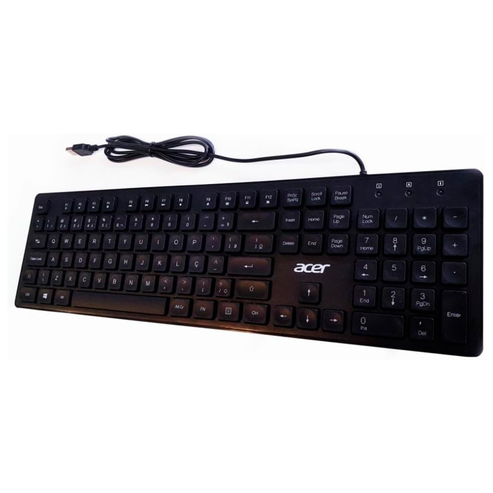 Teclado e mouse office com cabo Acer OCC300 Tenha mais conforto e praticidade no seu dia a dia com o Combo Teclado e Mouse Office com Cabo OCC300. Com um design compacto e funcional, o teclado oferece menos bordas, liberando mais espaço na sua mesa para movimentos amplos com o mouse - ideal para quem busca organização e eficiência no ambiente de trabalho. O teclado possui layout ABNT2 com 104 teclas físicas e teclado numérico, garantindo facilidade na digitação e acessibilidade para diferentes tipos de tarefas. Além disso, conta com as funções de atalho Fn + F1 até F12, tornando a navegação ainda mais rápida. Seu tamanho compacto facilita o transporte, sendo perfeito para uso em casa, no escritório ou em viagens. Já o mouse com fio OCC300 foi desenvolvido para atender com conforto tanto destros quanto canhotos. Com design ergonômico, pegada leve e sensor óptico de 1200 DPI, proporciona controle preciso e responsivo, ideal para longas jornadas de trabalho e navegação eficiente. Completo e resistente, o combo é ainda à prova de respingos de água, garantindo durabilidade e segurança em ambientes de trabalho intensos. O OCC300 é a escolha ideal para quem busca um conjunto de teclado e mouse confiável, confortável e prático. Especificações Teclado Desing: Ergonômico e confortável Cor: Preto Bases de apoio retrátil: Emborrachadas antiderrapante Material: Chassi em plástico ABS resistente Teclas: Antitravamentos Tipo de teclas: Membrana Teclado numérico: Sim Teclas multimidias: Fn+ F1 até F12 Quantidade de teclas: 104 (Padrão PT-BR ABNT 2) Quantidade total de clicks suportado: 10 milhões por tecla Tamanho do cabo e suas características: 1.5 de cabo revestido de plástico resistente Tipo de conexão: Com cabo USB Tipo-A Consumo de energia: 100 mA/hora Mouse Design: Simétrico e Ergonômico Cor: Preto Bases de apoio: Plástico Material: Chassi em plástico ABS resistente Sensor óptico: 1200 DPI Quantidade de botões: 3 Quantidade total de clicks suportado: 30 milhões por botões Tipo de conexão: Com cabo USB Tipo-A Tamanho do cabo e suas características: 1.5 de cabo revestido de plástico resistente Consumo de energia: 100 mA/hora Compatibilidade com Sistema Operacional dos dois produtos: Windows 11, Windows 10, Windows 8.1, Windows 8 e Windows 7 Imagens de caráter ilustrativo Informações divulgadas de acordo com o manual do fabricante Produto novo na caixa, lacrado com NF e garantia do fabricante de 12 meses. Em caso de dúvidas sobre informações técnicas, utilização, limitações e manuseio do produto, verifique o manual do fabricante. EAN4711474358707 NAC014115