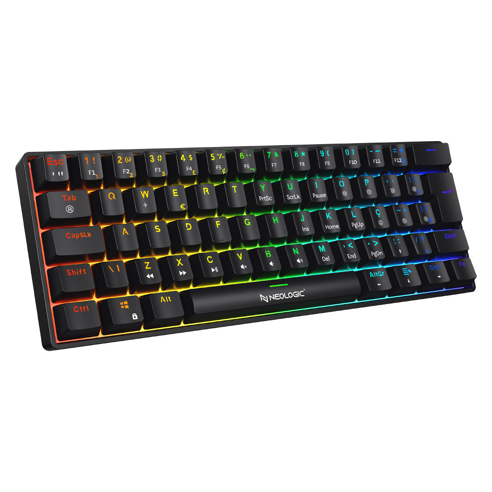 Teclado Gamer Mecânico Neologic Precision Pro Dark 60% RGB - Switch Blue e Hot Swap O Teclado Precision Pro Dark é a escolha perfeita para quem busca desempenho e personalização em cada partida. Com um formato 60% compacto e 61 teclas, ele oferece mobilidade máxima sem sacrificar o desempenho, ideal para configurações otimizadas e gamers que precisam de mais espaço para o mouse. Equipado com Switch Blue, proporciona uma experiência de jogo altamente responsiva e tátil, entregando o "click" perfeito para comandos rápidos e precisos. Além disso, o recurso Hot Swap permite que você troque os switches facilmente, adaptando o teclado ao seu estilo de jogo. O sistema de iluminação RGB personalizável com múltiplos efeitos cria uma atmosfera envolvente, proporcionando uma audiência completa em qualquer ambiente gamer. Seu design elegante na cor preta e cabo USB Tipo-C oferece praticidade e um visual moderno. O Neologic Precision Pro Dark é mais que um teclado, é um dispositivo que vai elevar seu nível de jogo, combinando tecnologia de ponta, personalização e portabilidade. - 2 níveis de ajuste de altura e almofada de silicone na parte inferior para antiderrapante. Características: Marca: Neologic Cor: Preta Modelo: PRODRK-BLUE Switch: Blue Teclas: 61 Teclas: Anti-ghosting total Iluminação: RGB / 18 tipos de modo LED Interruptor: Vida útil de até 50 milhões de cliques Layout: ABNT2 Cabo de PVC: Destacável de 1,6 m com anel magnético Cabo: USB Tipo C (Teclado) / USB-A (PC) Dimensões: 292 x 102 x 39 mm Peso: 550g Garantia: 12 meses