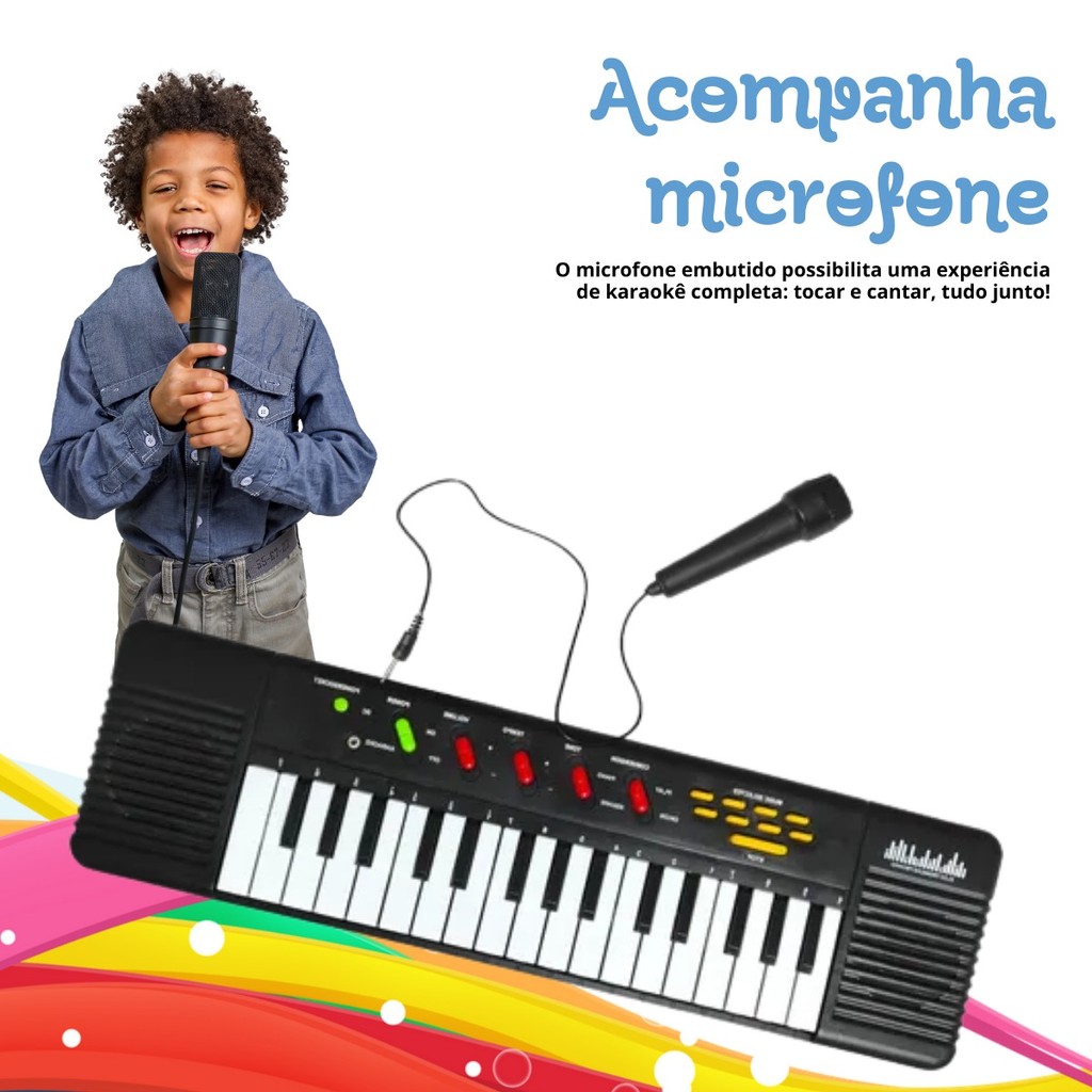 Teclado Infantil 32 Teclas Com Microfone Karaokê Brinquedo Crianças Musical Educativo Kizumba O Teclado Infantil com Microfone Karaokê 32 Teclas é o brinquedo perfeito para estimular a musicalidade e criatividade das crianças. Com design colorido e divertido, ele permite que os pequenos descubram o mundo da música de forma prática e interativa. São 32 teclas que reproduzem sons realistas, ideais para as primeiras experiências musicais, além de um microfone que possibilita brincar de cantar e soltar a voz no estilo karaokê. Um brinquedo educativo que desenvolve coordenação motora, concentração e ritmo, proporcionando horas de diversão saudável. Leve, portátil e fácil de usar, pode ser levado em viagens e encontros familiares, transformando qualquer momento em um verdadeiro show. Perfeito para presentear meninos e meninas que amam música! Especificações Técnicas: • Número de teclas: 32 (19 Brancas e 12 Pretas) • Função: Musical e karaokê • Faixa etária: A partir de 3 anos • Alimentação: 4 Pilhas (não inclusas) Dimensões: Comprimento: 47 cm Altura: 3 cm Largura: 15 cm Microfone: 10 cm FAQ – Perguntas Frequentes 1. O teclado funciona com pilhas? Sim, funciona com pilhas AA (não inclusas). 2. O microfone realmente amplifica a voz? Sim, o microfone amplifica o som para brincar de karaokê. 3. É indicado para qual idade? Recomendado para crianças a partir de 3 anos. 4. Ele vem com músicas pré-programadas? Sim, possui algumas funções musicais e sons de demonstração. Conteúdo da Embalagem • 01 Teclado Infantil 32 Teclas • 01 Microfone Importante Valor Unitário. Imagens Meramente Ilustrativas. Não nos responsabilizamos pelo mau uso do produto.