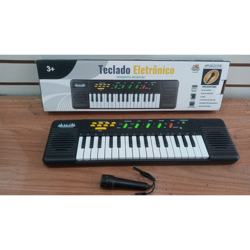 Teclado Infantil! Esse teclado é uma ótima maneira de se divertir e aprender ao mesmo tempo. Ele é perfeito tanto para a diversão, como também é uma ótima maneira de oferecer ao ambiente um toque descontraído e divertido. Pode proporcionar momentos muito agradáveis com a família e os amigos. CARACTERÍSTICAS: - Material: Plástico - Cor: Predominantemente preto - Toca vários tipos de música e sons - Possui opção de abaixar e almentar volume - Acompanha microfone Medidas: - altura: 13cm - largura: 46cm Funciona a base de 3 pilhas do tipo AA.