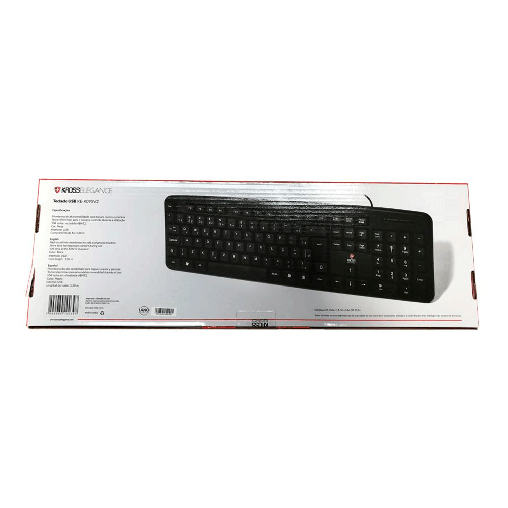 CARACTERÍSTICA- Marca: Kross;- Modelo: KE-K095V2;ESPECIFICAÇÕESCOMPATIBILIDADE- Windows xp/vista/win7/win8/win10 e mac os x 10.2 ou superior;COMPRIMENTO DO CABO- Aprox. 1,30m;CONECTOR- USB;COR- Preto;DIMENSÕES- 406 x 125 x 24,5mm;NÚMERO DE TECLAS- 104;PADRÃO- ABNT2;TIPO- Standard;INFORMAÇÃO ADICIONAL- Não requer a instalação de driver para funcionamento(plug and play);TECLAS DE TOQUE MACIO E DE ALTA PRECISÃO- Mais conforto para digitação;- Formato compacto para melhor instalação;SISTEMA SPLASH-PROOF- Maior proteção contra respingos;CONTEÚDO DA EMBALAGEM- 1x Teclado Fortrek Skl-106, USB, ABNT2, Preto - Fk325k.