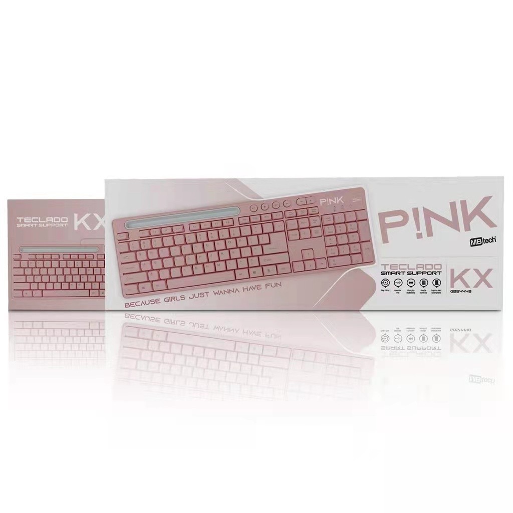 Teclado Multimídia USB Pink Smart Support KX Rosa MBTech MB4448 Conheça o Teclado USB Multimidia com suporte para celular. Designer moderno, com esse teclado você não precisa de suporte na sua mesa. Especificações: Conexão: Usb 2.0 Layout: Abnt2 Material: Abs+hips 6 Funções Multimídia Compatível: Windows 7 / 8 / 10 Comprimento Do Cabo: 1,50m Teclas: 108 Teclas Cor: Rosa Dimensões Do Teclado: Comprimento: 2,7cm Largura: 44cm Altura: 14,5cm