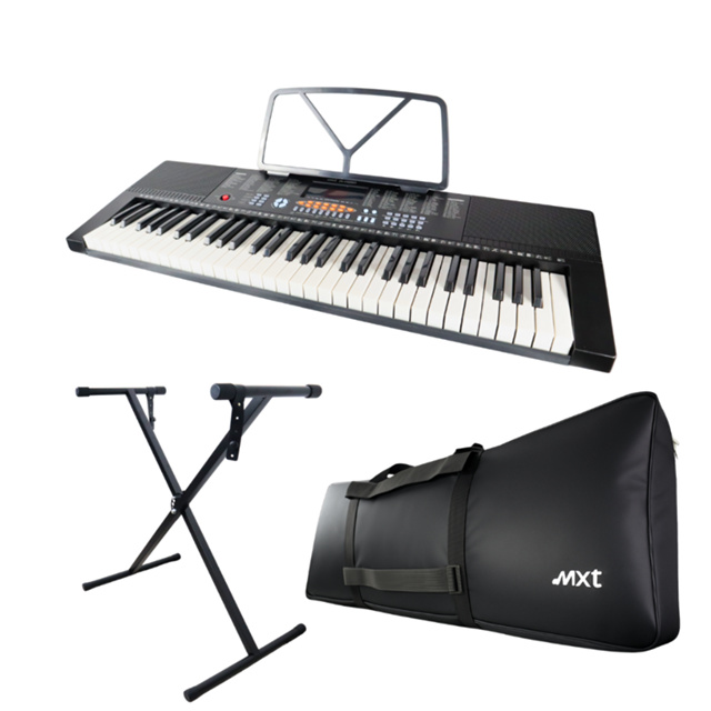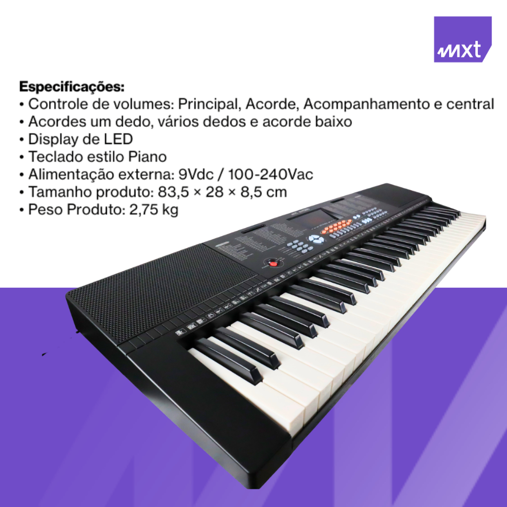 Kit 3 Peças Teclado MXT T1280 – Teclado 61 Teclas + Capa + Suporte Ajustável Descrição completa Marca: MXT Modelo teclado: T1280 61 teclas Modelo Capa: Capa estofada Modelo Suporte : Qx-10 Apresentamos o kit ideal para quem quer tocar com conforto proteção e suporte de qualidade O Kit 3 Peças para Teclado T1280 MXT inclui teclado capa estofada e suporte regulável Tudo para montar seu setup musical de forma prática Itens inclusos no kit * Teclado modelo T1280 MXT com 61 teclas estilo piano display LED * Capa estofada para teclado tamanho aproximado 100 x 42 x 14 cm * Suporte para teclado com base de chão 44 cm altura mínima 31 cm altura máxima 96 cm ideal para acomodar o teclado confortavelmente Principais características do teclado * Controle de volumes: principal acorde acompanhamento central * Funções de acorde: acorde de um dedo vários dedos e acorde baixo * Display de LED para fácil visualização das funções * Teclado estilo piano proporcionando visual e sensação mais profissional * Alimentação externa 9 Vdc bivolt 100-240 Vac * Tamanho do teclado 83,5 x 28 x 8,5 cm * Peso do teclado aproximadamente 1,800 kg Por que escolher este kit * Solução completa teclado proteção suporte * Ótimo para iniciantes estúdios caseiros ou quem busca praticidade * Suporte ajustável permite adaptar a altura conforme posição de tocar sentado ou em pé * Capa estofada ajuda transportar armazenar o teclado com segurança Informações importantes * Produto novo com nota fiscal e garantia * Enviado com embalagem reforçada para garantir segurança no transporte * Frete conforme cep informado consulte prazo e valor no anúncio * Em caso de dúvidas pergunte antes da compra ou revise nossa política de devolução Aproveite agora e garanta seu kit completo para teclado praticidade proteção e suporte em um só anúncio
