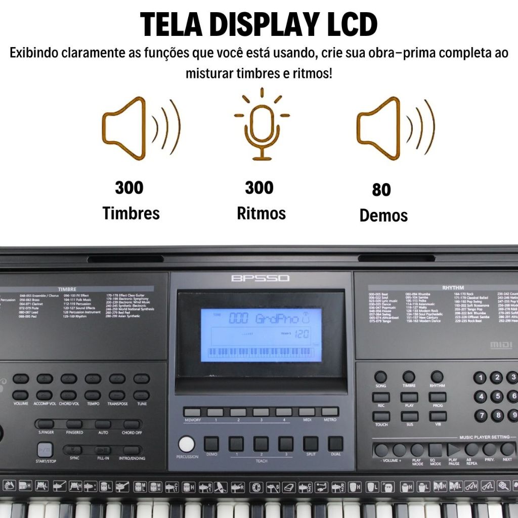 Itens inclusos: 1x Teclado Musical 5/8 Bravo Bp550 1x Fonte para teclado 1x Suporte partituras de teclado Introduzindo o Teclado Musical Bravo BP-550, o novo padrão em termos de teclados musicais que oferecem um incrível custo-benefício. Projetado meticulosamente para estudantes e pro publico intermediário musicais, este teclado 5/8 é uma escolha inigualável para aprimorar suas habilidades musicais. Com uma impressionante variedade de recursos, o Bravo BP-550 coloca o poder da música ao seu alcance. Conta com teclas sensitivas, permite que o tecladista determine a intensidade do som por meio do seu toque. Com 300 timbres e 300 ritmos, você terá uma ampla gama de sons para explorar e se inspirar. Além disso conta com 80 demos, a diversidade musical está sempre à sua disposição. Não apenas um teclado, mas também um professor, o BP-550 oferece três modos de ensino para ajudá-lo a aprimorar suas habilidades musicais de maneira eficaz. Com saída para fones de ouvido ou caixas de som, entrada para microfone externo e entrada de áudio P2, este teclado se adapta facilmente às suas necessidades de conexão. E, com a opção de alimentação via fonte externa ou pilhas AA, Acompanha entrada para USB Midi, você pode levar sua música onde quer que vá. Especificações: Teclado de resposta ao toque com 61 teclas, estilo piano 300 Timbres 300 Ritmos 80 Demos 3 Modos De Ensino 61 Percussões no teclado Música Controle De Volume Principal Controle De Volume De Acompanhamento Transposição Tempo Funções: Sustain / Vibrato / Metro / Split / Record / Program / Demo One / Demo All Saída Para Fones De Ouvido ou Caixa de Som, Audio Stereo Entrada Para Microfone Externo, USB Midi, Pedal Sustain, Áudio P2 Obs: USB reconhece apenas arquivos MP3 Alimentação: Fonte externa (incluso) Dimensões do teclado: 96x36x14cm Dimensões teclas: 13,5x2,5cm Produto 100% original com garantia em todo Brasil.