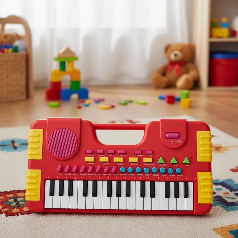 Apresentamos o Piano Teclado Infantil Grava Sons Ritmos na cor vermelha, um brinquedo encantador da loja Guedes. Este teclado foi projetado especialmente para estimular a criatividade e o amor pela música desde os primeiros anos de vida. Com 31 teclas, é ideal para crianças a partir de 3 anos, proporcionando uma experiência musical divertida e educativa. Fabricado em plástico de alta qualidade, o teclado é leve e fácil de manusear, tornando-o perfeito para os pequenos artistas. O modelo Tecladinho Red traz sons diversificados e ritmos animados, permitindo que as crianças explorem e experimentem a música de maneira lúdica. Além disso, o design envolvente e colorido é atraente para os jovens músicos. A alimentação é feita por pilhas, o que permite que as crianças toquem em qualquer lugar, promovendo momentos de diversão em família. O tamanho compacto de 35 cm de comprimento, 15 cm de largura e 5 cm de altura facilita o armazenamento e o transporte do instrumento. A experiência musical proporcionada por este teclado ajuda a desenvolver habilidades auditivas e motoras nos pequenos. Com este Piano Teclado Infantil, as crianças poderão criar suas próprias canções e se divertir aprendendo sobre música. É uma excelente escolha para presentes, garantindo horas de diversão e entretenimento em casa. Invista na criatividade do seu filho com um instrumento que combina diversão e aprendizado.