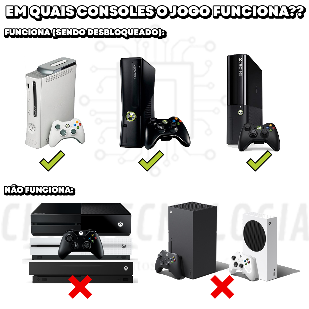 ATENÇÃO!!!! NOSSA LOJA TRABALHA SOMENTE COM JOGOS PARA CONSOLES DESBLOQUEADOS!!! Selecione a destrava correspondente ao que o seu console possui na hora da compra! caso não saiba o modelo de desbloqueio que seu console possui, no anuncio mesmo possui um vídeo com o passo a passo, caso não tenha, entre em contato conosco pelo chat que vamos te orientar! PARA A VERSÃO LT 3.0: (R$ 19,90 ~ R$ 31,90) - DVD Gravado em Baixa Velocidade de 3x - Mídia Printavel (sem encarte do jogo) - Saquinho Plástico com Encarte do jogo - Disco testado antes do envio - Jogos com a Logo Xbox Live é permitido jogar online (xbox live gold necessaria). OBS: ESSA VERSÃO EM CD NÃO FUNCIONA, DE FORMA ALGUMA, EM VIDEOS BLOQUEADOS OU COM DESTRAVA RGH, FUNCIONA SOMENTE EM XBOX 360 DESBLOQUEADO COM LT 3.0 PARA A VERSÃO RGH: (R$ 34,90) - DVD Gravado em Baixa Velocidade de 3x - Compatíveis com Dash Aurora e Freestyle - Mídia Printavel (sem encarte do jogo) - Saquinho Plástico com Encarte do jogo - Disco testado antes do envio OBS: É NECESSÁRIO QUE O LEITOR DO EQUIPAMENTO ESTEJA FUNCIONANDO PARA QUE O JOGO POSSA LER. - Jogos que são somente online é necessário que sua Dash esteja configurada para jogar online. Para jogos Online é necessario configuração da Xbox Live atraves da DashLaunch. OBS: ESSA VERSÃO EM PENDRIVE NÃO FUNCIONA, DE FORMA ALGUMA, EM VIDEO GAME BLOQUEADO OU COM DESTRAVAS LT 3.0 e JTAG. FUNCIONA SOMENTE EM XBOX 360 RGH. PARA A VERSÃO JTAG (RGH DVD): (R$ 34,90) - DVD gravado em versão Jtag - GRAVADO EM VELOCIDADE 3X - Mídia printável (sem encarte do jogo) - Saquinho Plástico com Encarte do jogo - Disco testado antes do envio - Jogo que exigem conexão com modo online não será possível jogar em versão JTAG caso não saiba o modelo de desbloqueio que seu console possui, no anuncio mesmo possui um vídeo com o passo a passo, caso não tenha, entre em contato conosco pelo chat que vamos te orientar! - AMBOS OS PRODUTOS, NÃO FUNCIONAM EM XBOX 360 BLOQUEADO. - AMBOS OS PRODUTOS, NÃO FUNCIONAM EM XBOX ONE. - AMBOS OS PRODUTOS, NÃO FUNCIONAM EM XBOX SERIES S. - AMBOS OS PRODUTOS, NÃO FUNCIONAM EM XBOX SERIES X. - JOGOS QUE POSSUEM MODO ONLINE, É NECESSARIA ASSINATURA DA XBOX LIVE GOLD!