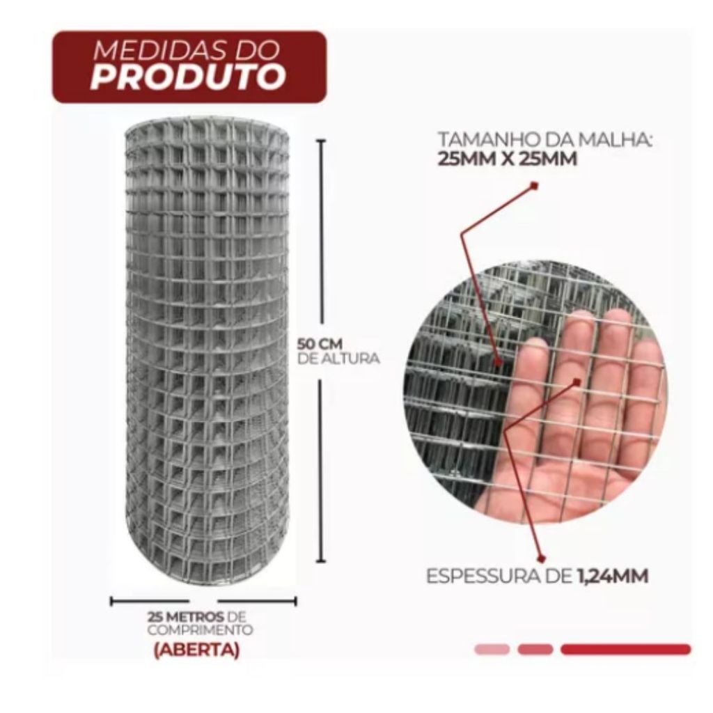 Sobre o ENVIO: - ENVIO EM ATÉ 36 HORAS. - ENVIAMOS PARA TODO O BRASIL - ACOMPANHA NOTA FISCAL E EMBALAGEM DO PRODUTO - EMPRESA COM CREDIBILIDADE, ATUANDO HÁ MAIS DE 15 ANOS NO MERCADO. - FOTOS REAIS (FOTO DE ACORDO COM O QUE É O PRODUTO, SEM ENGANAÇÕES!) - ATENDIMENTO HUMANIZADO E FOCADO EM ATENDER AS EXPECTATIVAS DE NOSSOS CLIENTES. *******************NO FINAL DA DESCRIÇÃO, AS PRINCIPAIS DÚVIDAS ESTÃO RESPONDIDAS.************************* Descrição Tela Soldada Galvanizada 2,5x2,5 5cm Fio 1,24mm Altura 50cm. - Ideal para cercamentos e fechamentos de terrenos em geral. - É uma tela fácil de manusear e possui uma malha bem fechada, impedindo a passagem de animais, pessoas e também objetos. - A tela é Semi-rígida o que facilita a instalação e não entorta facilmente. - Não enferruja. Principais Aplicações: - Cercamento de residências; - Tela ideal para hortas e jardins; - Tela para pequenos animais ( Coelhos, Cães pequenos, Gatos, Galinhas, Pássaros de médio porte, aves etc...); - Fabricação de estruturas metálicas, grades e portões para serralheria. Não Recomenda-se: - Para contenção de animais de grande porte. - Para áreas com alta exigência de proteção ou segurança. - Para quadras esportivas ou outros locais onde ocorrerão impactos constante. Especificações: - Fio galvanizado; - Formato similar à grade; - Pontos de solda por resistência, evitando rompimento; - Baixo custo de instalação; Itens Inclusos: - 1 Rolo de tela. (50cm x METRAGEM A SER DEFINIDA PELO CLIENTE) Dimensões: - Fio: 1,24 mm. - Altura do rolo: 50cm - Comprimento do rolo: (METRAGEM A SER DEFINIDA PELO CLIENTE) - Espaçamento entre fios (Malha): 2,5x2,5cm