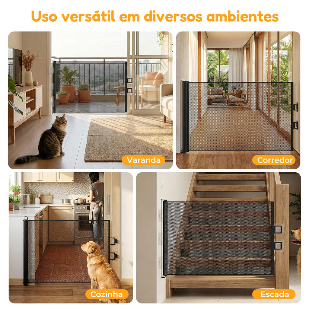 Portão Retrátil de Segurança para Pets 🔒 Mantenha seus pets protegidos com praticidade e sem ocupar espaço na sua casa. O Portão Retrátil em Tela foi desenvolvido para criar uma barreira segura para cães e gatos, permitindo circulação controlada dentro de casa. Com sistema ajustável de largura e recolhimento compacto, ele se adapta facilmente a diferentes ambientes. Ideal para quem busca segurança, organização e praticidade no dia a dia. Principais Benefícios 🐾 🔹Controla o acesso de pets a áreas específicas 🔹Sistema retrátil que economiza espaço 🔹Tela macia e resistente, segura para cães e gatos 🔹Fácil instalação 🔹Uso interno e externo Diferenciais do Produto ⭐ ✔ Sistema Retrátil Ajustável Adapta-se a diferentes larguras de portas, corredores e escadas. ✔ Malha Sintética de Alta Resistência Tela reforçada, flexível e resistente, que não machuca os pets. ✔ Design Compacto Quando recolhido, ocupa apenas cerca de 9 cm na parede. ✔ Fixação Estável e Segura Estrutura lateral em plástico resistente com travamento firme. ✔ Mais Seguro que Grades de Metal Sem barras rígidas que possam machucar ou permitir passagem pelas frestas. ✔ Multiambiente Pode ser usado em: 🔹Portas 🔹Corredores 🔹Escadas 🔹Varandas 🔹Cozinhas Informações Técnicas 📐 🔹Altura: 70 cm 🔹Opções de largura: 110 cm, 130 cm, 150 cm ou 180 cm 🔹Material da tela: Malha sintética reforçada 🔹Estrutura lateral: Plástico resistente 🔹Cor: Preto 🔹Sistema: Retrátil com trava lateral 🔹Uso: Interno e externo Indicado Para 🏡 🔹Casas e apartamentos 🔹Ambientes com escadas 🔹Separação de áreas internas 🔹Controle de acesso de cães e gatos 📦 Acompanha: 1 x Portão retrátil em malha 5 x Suportes de fixação