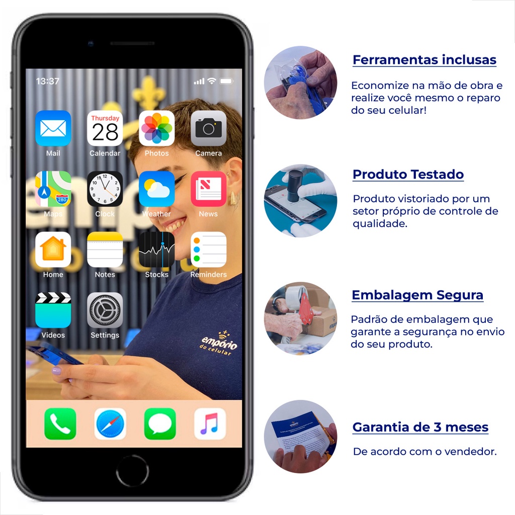 Tela Display Frontal iPhone 8 Plus Preto Empório Standard Tela de reposição da marca Empório do Celular para o seu iPhone 8 Plus, com total garantia de compatibilidade com o seu aparelho. Se sua tela quebrou ou está com defeito, compre agora e tenha o seu aparelho novo de novo. CARACTERÍSTICAS: Tamanho da Tela: 5.5" polegadas Resolução da Tela: 1080 x 1920 pixels Densidade da Tela: 401 ppi Tecnologia da Tela: IPS LCD Tipo de Touchscreen: Capacitivo Multitouch: Sim Tipo de Proteção: Scratch-resistant glass FUNCIONALIDADE: A substituição desta tela restabelece todas as funções do TOUCH SCREEN e LCD/DISPLAY (VIDRO/TOQUE E IMAGEM). MARCA: Empório do Celular COMPATIBILIDADE: A1864, A1897, A1898 COR: Preto QUALIDADE: Standard *Saiba mais na seção "Qualidades Empório" abaixo no texto. GARANTIA: 3 meses contra defeitos de fabricação. ITENS INCLUSOS: - 1 unid. Tela Frontal - 1 unid. Kit de Ferramentas - Manual Digital / Online para a instalação da peça SOBRE A EMPRESA: A EMPÓRIO DO CELULAR é a empresa líder no segmento de peças de reposição para celulares e smartphones. Fundada em 2013 na cidade de São Paulo, hoje possui uma estrutura de 400m² de área operacional e 1 loja física situada no bairro da Barra Funda. OBJETIVO: Em todo o processo da sua compra nosso foco sempre será no conserto do seu dispositivo móvel e consequentemente na sua satisfação. Não vendemos apenas um produto, e sim, uma solução de conserto para seu aparelho. Afinal, hoje em dia não dá para ficar sem um celular, certo? QUALIDADES EMPÓRIO: Todas as peças da EMPÓRIO DO CELULAR utilizam componentes originais em sua montagem, sendo dividida pela fabricante mundial de componentes para celulares em diversas grades após os testes. A EMPÓRIO DO CELULAR é a única empresa do segmento de trazer isso ao mercado brasileiro com 100% de transparência. Os produtos são separados em 3 grades: STANDARD, PREMIUM e EMPORIO PRO. STANDARD - Vendida pela maioria das outras lojas no Brasil, foi pensada para clientes que desejam obter uma qualidade padrão com um baixo custo de investimento e garantia de 3 meses. PREMIUM - É a principal linha da Empório do Celular, com a melhor relação entre custo benefício do mercado e garantia de 6 meses. São peças de alta qualidade e fidelidade, cuja similaridade à peça que vem de fábrica no aparelho excede 80%. EMPÓRIO PRO - É exatamente a mesma qualidade da peça que vem no aparelho de fábrica. Recomendada para os clientes mais exigentes e que se preocupam em obter a melhor qualidade do mercado, e justamente por confiarmos no produto, oferecemos 12 meses de garantia. TESTE DE QUALIDADE: Todos os nossos produtos são vistoriados por um setor próprio de controle de qualidade. No caso de telas, touch e display temos profissionais capacitados que realizam os seguintes testes da peça no próprio aparelho: - Análise do produto esteticamente (Superfície, Cor, Vidro, Material) - Análise do produto na montagem (cola, aro) - Funcionalidade do Touch Screen - Teste do Display (Imagem) para verificação de brilho, coloração e resolução feito por humano. - Teste do Display (Imagem) para verificação de brilho, coloração e resolução feito por máquinas industriais com resultado analisado automaticamente por software. LOJA FÍSICA: É possível retirar pessoalmente seu pedido em nossa Loja Física, no bairro da Barra Funda, Zona Oeste de São Paulo. Neste caso, você precisa realizar a compra online por 1 de nossos canais de venda. Após a confirmação do pagamento seu pedido fica disponível de imediato para retirada. Você também pode comprar diretamente na loja física. Preços e disponibilidade que podem ser diferentes dos apresentados aqui no Mercado Livre, recomendamos que nos consulte antes. Já sabe onde vai fazer a manutenção do seu celular? Em nossa loja também prestamos serviços de assistência técnica, podendo realizar a manutenção em seu aparelho em até 30 minutos* mediante agendamento e pagamento adicional. PARA EMPRESAS: Na Empório do Celular temos uma área responsável em entender e atender clientes corporativos com um atendimento personalizado por um vendedor que atenda sua região lhe oferecendo preços diferenciados, condições de pagamento flexíveis, formas de entrega rápida e garantia exclusiva. Não importa se você está começando agora e precisando de uma peça por semana ou se você já é grande, nosso objetivo é entender como podemos melhorar seu negócio e crescer junto com ele. Atendemos as maiores lojas (de rua e shopping), franquias, seguradoras e distribuidores de todo o Brasil. Entre em contato conosco por algum canal de atendimento, será um prazer ter você como um de nossos parceiros.