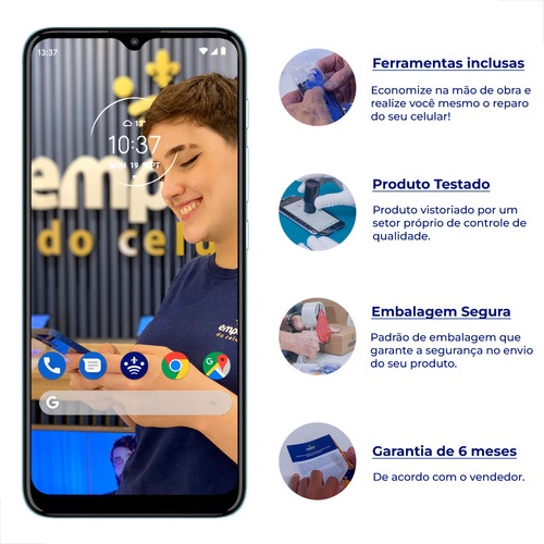 Tela Frontal Display LCD Compatível Moto E20 XT2155 Empório Tela de reposição da marca Empório do Celular para o seu Moto E20 com total garantia de compatibilidade com o seu aparelho. Se sua tela quebrou ou está com defeito, compre agora e tenha o seu aparelho novo de novo. CARACTERÍSTICAS: Tamanho da Tela: 6.5" polegadas Resolução da Tela: 720 x 1600 pixels Densidade da Tela: 270 ppi Tecnologia da Tela: IPS LCD Tipo de Touchscreen: Capacitivo Multitouch: Sim FUNCIONALIDADE: A substituição desta tela restabelece todas as funções do TOUCH SCREEN e LCD/DISPLAY (VIDRO/TOQUE E IMAGEM). MARCA: Empório do Celular COMPATIBILIDADE: XT2155, XT2155-1, XT2155-3 COR: Preto QUALIDADE: Standard *Saiba mais na seção "Qualidades Empório" abaixo no texto. GARANTIA: 3 meses contra defeitos de fabricação. ITENS INCLUSOS: - 1 unid. Tela Frontal - 1 unid. Kit de Ferramentas - Manual Digital / Online para a instalação da peça SOBRE A EMPRESA: A EMPÓRIO DO CELULAR é a empresa líder no segmento de peças de reposição para celulares e smartphones. Fundada em 2013 na cidade de São Paulo, hoje possui uma estrutura de 400m² de área operacional e 1 loja física situada no bairro da Barra Funda. OBJETIVO: Em todo o processo da sua compra nosso foco sempre será no conserto do seu dispositivo móvel e consequentemente na sua satisfação. Não vendemos apenas um produto, e sim, uma solução de conserto para seu aparelho. Afinal, hoje em dia não dá para ficar sem um celular, certo? QUALIDADES EMPÓRIO: Todas as peças da EMPÓRIO DO CELULAR utilizam componentes originais em sua montagem, sendo dividida pela fabricante mundial de componentes para celulares em diversas grades após os testes. A EMPÓRIO DO CELULAR é a única empresa do segmento de trazer isso ao mercado brasileiro com 100% de transparência. Os produtos são separados em 3 grades: STANDARD, PREMIUM e EMPORIO PRO. STANDARD - Vendida pela maioria das outras lojas no Brasil, foi pensada para clientes que desejam obter uma qualidade padrão com um baixo custo de investimento e garantia de 3 meses. PREMIUM - É a principal linha da Empório do Celular, com a melhor relação entre custo benefício do mercado e garantia de 6 meses. São peças de alta qualidade e fidelidade, cuja similaridade à peça que vem de fábrica no aparelho excede 80%. EMPÓRIO PRO - É exatamente a mesma qualidade da peça que vem no aparelho de fábrica. Recomendada para os clientes mais exigentes e que se preocupam em obter a melhor qualidade do mercado, e justamente por confiarmos no produto, oferecemos 12 meses de garantia. TESTE DE QUALIDADE: Todos os nossos produtos são vistoriados por um setor próprio de controle de qualidade. No caso de telas, touch e display temos profissionais capacitados que realizam os seguintes testes da peça no próprio aparelho: - Análise do produto esteticamente (Superfície, Cor, Vidro, Material) - Análise do produto na montagem (cola, aro) - Funcionalidade do Touch Screen - Teste do Display (Imagem) para verificação de brilho, coloração e resolução feito por humano. - Teste do Display (Imagem) para verificação de brilho, coloração e resolução feito por máquinas industriais com resultado analisado automaticamente por software. LOJA FÍSICA: É possível retirar pessoalmente seu pedido em nossa Loja Física, no bairro da Barra Funda, Zona Oeste de São Paulo. Neste caso, você precisa realizar a compra online por 1 de nossos canais de venda. Após a confirmação do pagamento seu pedido fica disponível de imediato para retirada. Você também pode comprar diretamente na loja física. Preços e disponibilidade que podem ser diferentes dos apresentados aqui no Mercado Livre, recomendamos que nos consulte antes. Já sabe onde vai fazer a manutenção do seu celular? Em nossa loja também prestamos serviços de assistência técnica, podendo realizar a manutenção em seu aparelho em até 30 minutos* mediante agendamento e pagamento adicional. PARA EMPRESAS: Na Empório do Celular temos uma área responsável em entender e atender clientes corporativos com um atendimento personalizado por um vendedor que atenda sua região lhe oferecendo preços diferenciados, condições de pagamento flexíveis, formas de entrega rápida e garantia exclusiva. Não importa se você está começando agora e precisando de uma peça por semana ou se você já é grande, nosso objetivo é entender como podemos melhorar seu negócio e crescer junto com ele. Atendemos as maiores lojas (de rua e shopping), franquias, seguradoras e distribuidores de todo o Brasil. Entre em contato conosco por algum canal de atendimento, será um prazer ter você como um de nossos parceiros.