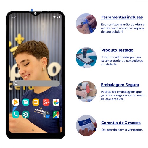 Tela Frontal Display LCD Compatível Moto G20 XT2128 Empório Tela de reposição da marca Empório do Celular para o seu Moto G20 com total garantia de compatibilidade com o seu aparelho. Se sua tela quebrou ou está com defeito, compre agora e tenha o seu aparelho novo de novo. CARACTERÍSTICAS: Tamanho da Tela: 6.5" polegadas Resolução da Tela: 720 x 1600 pixels Densidade da Tela: 270 ppi Tecnologia da Tela: IPS LCD Tipo de Touchscreen: Capacitivo Multitouch: Sim Proteção: Corning Gorilla Glass 3 FUNCIONALIDADE: A substituição desta tela restabelece todas as funções do TOUCH SCREEN e LCD/DISPLAY (VIDRO/TOQUE E IMAGEM). MARCA: Empório do Celular COMPATIBILIDADE: XT2128-1, XT2128-2 COR: Preto QUALIDADE: Standard *Saiba mais na seção "Qualidades Empório" abaixo no texto. GARANTIA: 3 meses contra defeitos de fabricação. ITENS INCLUSOS: - 1 unid. Tela Frontal - 1 unid. Kit de Ferramentas - Manual Digital / Online para a instalação da peça SOBRE A EMPRESA: A EMPÓRIO DO CELULAR é a empresa líder no segmento de peças de reposição para celulares e smartphones. Fundada em 2013 na cidade de São Paulo, hoje possui uma estrutura de 400m² de área operacional e 1 loja física situada no bairro da Barra Funda. OBJETIVO: Em todo o processo da sua compra nosso foco sempre será no conserto do seu dispositivo móvel e consequentemente na sua satisfação. Não vendemos apenas um produto, e sim, uma solução de conserto para seu aparelho. Afinal, hoje em dia não dá para ficar sem um celular, certo? QUALIDADES EMPÓRIO: Todas as peças da EMPÓRIO DO CELULAR utilizam componentes originais em sua montagem, sendo dividida pela fabricante mundial de componentes para celulares em diversas grades após os testes. A EMPÓRIO DO CELULAR é a única empresa do segmento de trazer isso ao mercado brasileiro com 100% de transparência. Os produtos são separados em 3 grades: STANDARD, PREMIUM e EMPORIO PRO. STANDARD - Vendida pela maioria das outras lojas no Brasil, foi pensada para clientes que desejam obter uma qualidade padrão com um baixo custo de investimento e garantia de 3 meses. PREMIUM - É a principal linha da Empório do Celular, com a melhor relação entre custo benefício do mercado e garantia de 6 meses. São peças de alta qualidade e fidelidade, cuja similaridade à peça que vem de fábrica no aparelho excede 80%. EMPÓRIO PRO - É exatamente a mesma qualidade da peça que vem no aparelho de fábrica. Recomendada para os clientes mais exigentes e que se preocupam em obter a melhor qualidade do mercado, e justamente por confiarmos no produto, oferecemos 12 meses de garantia. TESTE DE QUALIDADE: Todos os nossos produtos são vistoriados por um setor próprio de controle de qualidade. No caso de telas, touch e display temos profissionais capacitados que realizam os seguintes testes da peça no próprio aparelho: - Análise do produto esteticamente (Superfície, Cor, Vidro, Material) - Análise do produto na montagem (cola, aro) - Funcionalidade do Touch Screen - Teste do Display (Imagem) para verificação de brilho, coloração e resolução feito por humano. - Teste do Display (Imagem) para verificação de brilho, coloração e resolução feito por máquinas industriais com resultado analisado automaticamente por software. LOJA FÍSICA: É possível retirar pessoalmente seu pedido em nossa Loja Física, no bairro da Barra Funda, Zona Oeste de São Paulo. Neste caso, você precisa realizar a compra online por 1 de nossos canais de venda. Após a confirmação do pagamento seu pedido fica disponível de imediato para retirada. Você também pode comprar diretamente na loja física. Preços e disponibilidade que podem ser diferentes dos apresentados aqui no Mercado Livre, recomendamos que nos consulte antes. Já sabe onde vai fazer a manutenção do seu celular? Em nossa loja também prestamos serviços de assistência técnica, podendo realizar a manutenção em seu aparelho em até 30 minutos* mediante agendamento e pagamento adicional. PARA EMPRESAS: Na Empório do Celular temos uma área responsável em entender e atender clientes corporativos com um atendimento personalizado por um vendedor que atenda sua região lhe oferecendo preços diferenciados, condições de pagamento flexíveis, formas de entrega rápida e garantia exclusiva. Não importa se você está começando agora e precisando de uma peça por semana ou se você já é grande, nosso objetivo é entender como podemos melhorar seu negócio e crescer junto com ele. Atendemos as maiores lojas (de rua e shopping), franquias, seguradoras e distribuidores de todo o Brasil. Entre em contato conosco por algum canal de atendimento, será um prazer ter você como um de nossos parceiros.