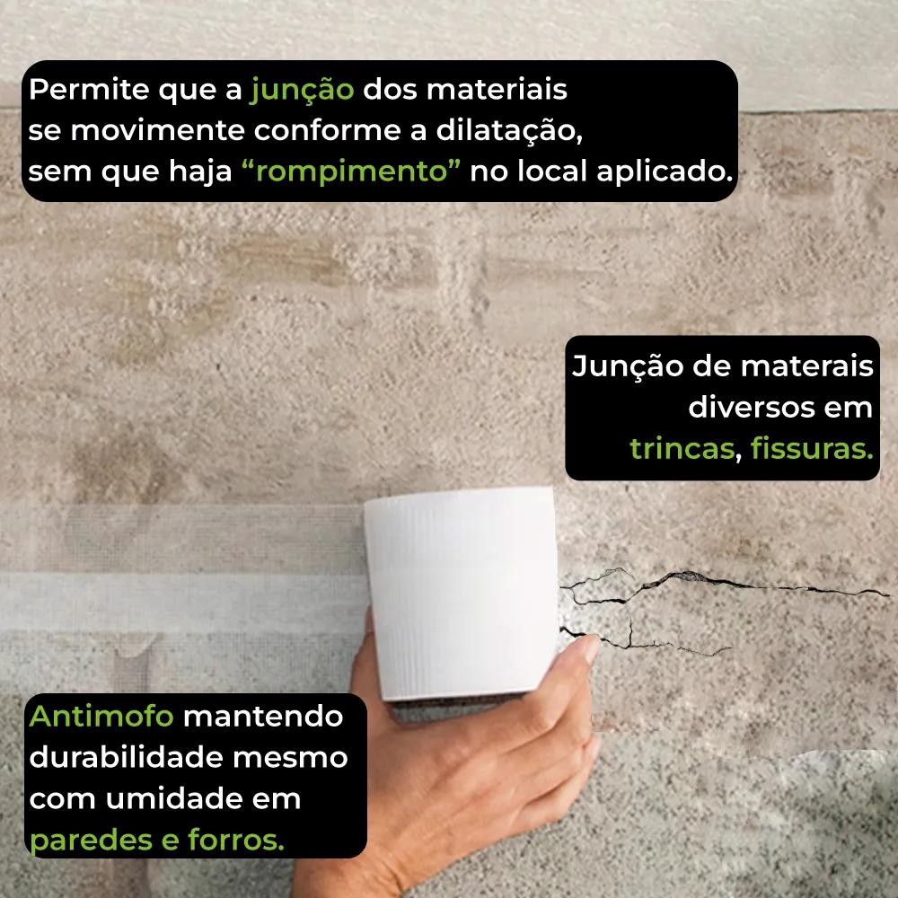 SOLUÇÃO PREVENTIVA E DE REPAROS DE TRINCAS EM PAREDES, JUNTAS E ENCUNHAMENTOS. A Telaflix possui um sistema pioneiro de bandagem central não aderente que permite que a junção dos materiais se movimente conforme a dilatação, sem que haja rompimento no local aplicado. Uma solução que também pode ser utilizada durante a construção, em junções de materiais diversos, onde as trincas e fissuras são mais propícias em função da ação do tempo. Além disso, a Telaflix é antimofo, permitindo maior durabilidade mesmo com a umidade comum em paredes e forros. COMPOSIÇÃO: Tela 100% poliéster autoadesiva com bandagem central não aderente de polipropileno. DIFERENCIAL: O sistema de bandagem central aplicado sobre as trincas, juntas de dilatação ou emendas, propicia a movimentação de suas bases (ou superfícies), sem que haja rompimento aparente da área revestida. ÁREA: Interna e externa. TELAFIX PARA TRINCAS E FISSURAS EM FORRO E PAREDE 10cm X 5mt