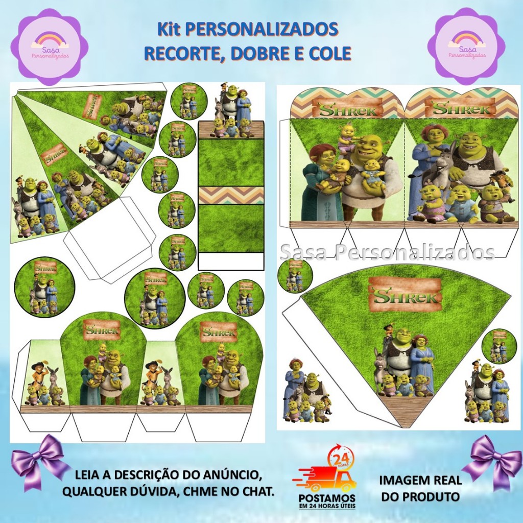 TEMA FAMÍLIA SHREK LEMBRANCINHAS COM 90/180 ITENS COM OU SEM NOME