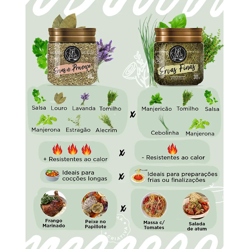 As Ervas Finas da BR Spices são um blend aromático que elevará o sabor de suas receitas! Sua versatilidade o permite realçar o frescor em molhos de salada ou até mesmo aprofundar os sabores em ragús de carne! Com uma combinação cuidadosa de ervas finas, cada pitada transforma suas criações culinárias em verdadeiras obras-primas! INGREDIENTES Manjericão, Salsa, Tomilho, Cebolinha Verde, Manjerona INFORMAÇÕES SOBRE O PRODUTO Sem Glút 0% glutamato Sem conservantes Sem corantes Ingredientes 100% naturais Pote Pet - Tampa Alumínio COMBINA COM Salada, Peixe QUER DESCOBRIR DICAS DE OURO DO NOSSO CHEF FUNDADOR? Você sabia que o calor e a umidade são inimigos de temperos 100% naturais e puros? Por isso, aqui na BR Spices recomendamos que armazene as embalagens em local fresco e livre de umidade. CONHEÇA A BR SPICES Somos uma empresa jovem que nasce de uma cozinha moderna e acessível. Carregamos em nosso DNA a criatividade, alegria e o espírito empreendedor brasileiro. Boa cozinha para nós é a cozinha criativa, seja um prato prático e saudável para o dia a dia ou uma receita de domingo que faz viajar no tempo e na memória.