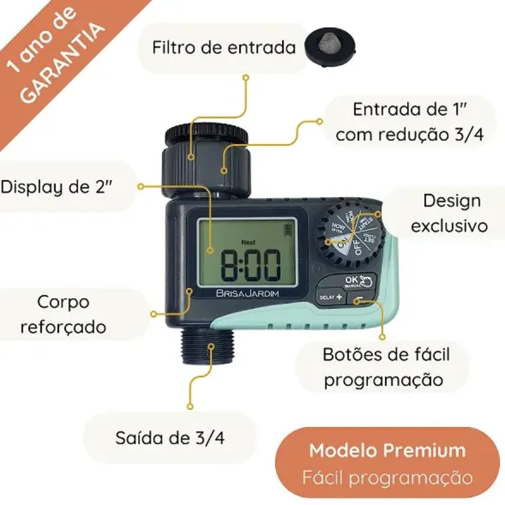 Diga adeus à rega manual e dê boas-vindas a um jardim exuberante e saudável com o Temporizador Digital para Irrigação com 1 Saída!Este dispositivo inteligente e prático permite automatizar a rega do seu jardim de forma eficiente e personalizada, controlando uma área de irrigação com programações específicas. Com ele, você economiza água, tempo e garante que suas plantas recebam a quantidade ideal de água, mesmo quando você estiver ausente. Detalhes do produto: Programação personalizada: defina horários, duração e frequência de rega específicos para sua área de irrigação. Economia de água: evite o desperdício e utilize a quantidade ideal para cada planta. Praticidade: automatize a rega e ganhe mais tempo livre. Resistente e durável: projetado para resistir às intempéries. Fácil instalação e uso: configure e programe o temporizador em minutos.