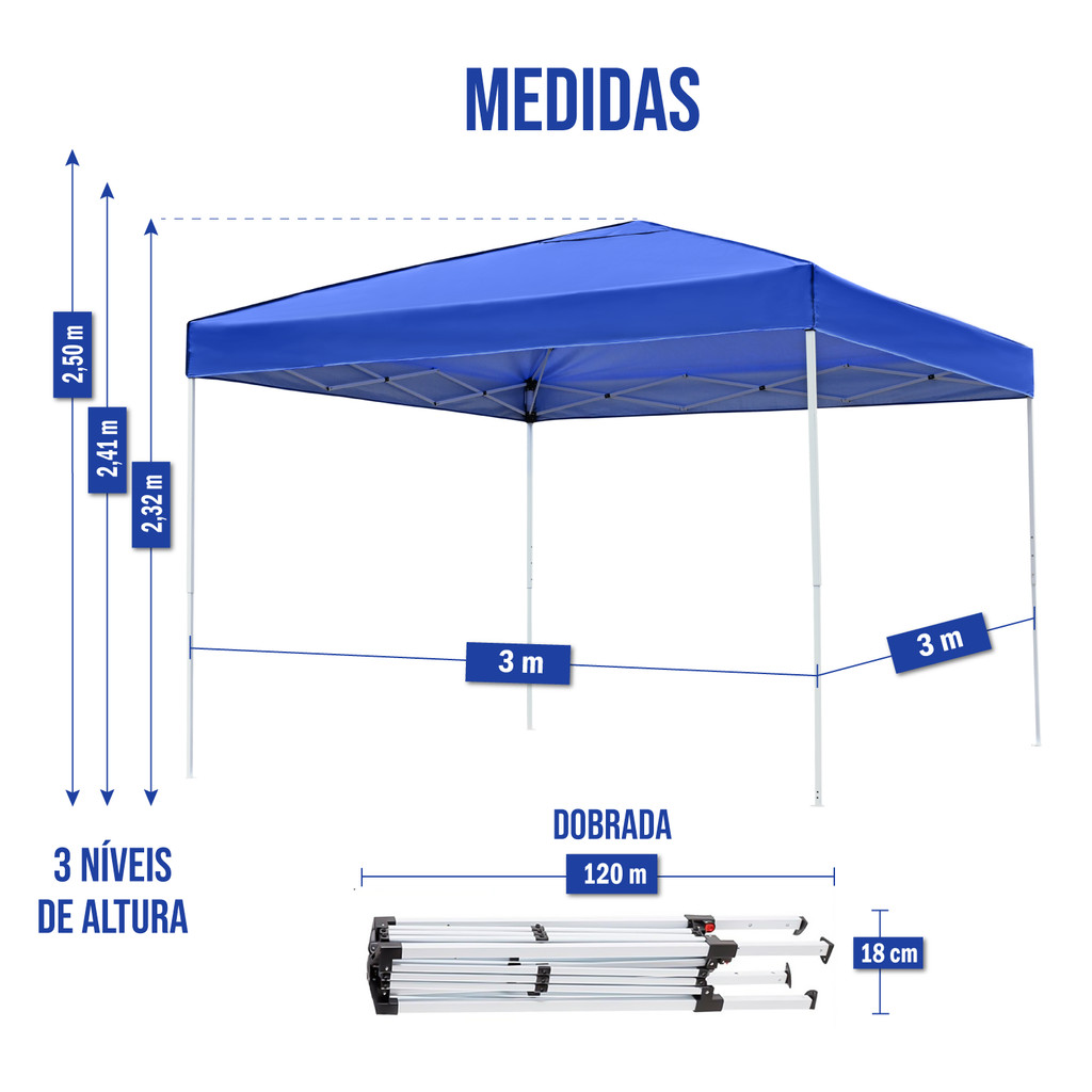 Tenda Praia Gazebo Articulada Dobrável 3x3 Barraca Camping A tenda é ideal para praia, camping e eventos ao ar livre. Oferece ampla área de sombra, fácil montagem, estrutura resistente e boa ventilação, garantindo conforto, praticidade e proteção contra o sol. O que você vai receber: 1 Bolsa para transporte 4 Estacas para fixação. Informações do produto: Cor: Azul Material: 420D Poliéster (Sintético, impermeável e com proteção uv) Resistente a corrosão Laterais com reforço em metal Sistema Flexi Lock: Evita que você prenda o dedo ao armar e desarmar Medidas do produto (aproximadas): Produto montado: Largura: 3 m Comprimento: 3 m Possui 3 alturas, todas reguláveis. Altura 1: 1,57 m (do chão ao início do tecido) 2,32 m (do chão ao topo do gazebo) Altura 2: 1,66 m (do chão ao início do tecido) 2,41 m (do chão ao topo do gazebo) Altura 3: 1,75 m (do chão ao início do tecido) 2,50 m (do chão ao topo do gazebo) Produto desmontado: Altura: 18 cm Largura: 18 cm Profundidade: 120 cm Medidas da embalagem: 18cm x 18cm x 120cm. Perguntas frequentes: Todos os produtos são novos e possuem garantia de 3 meses. Envio rápido, com postagem em até 24 horas úteis após o pagamento aprovado. Caso tenha mais alguma dúvida ou precise de maiores informações, utilize o campo de perguntas. Estamos à disposição para ajudar.