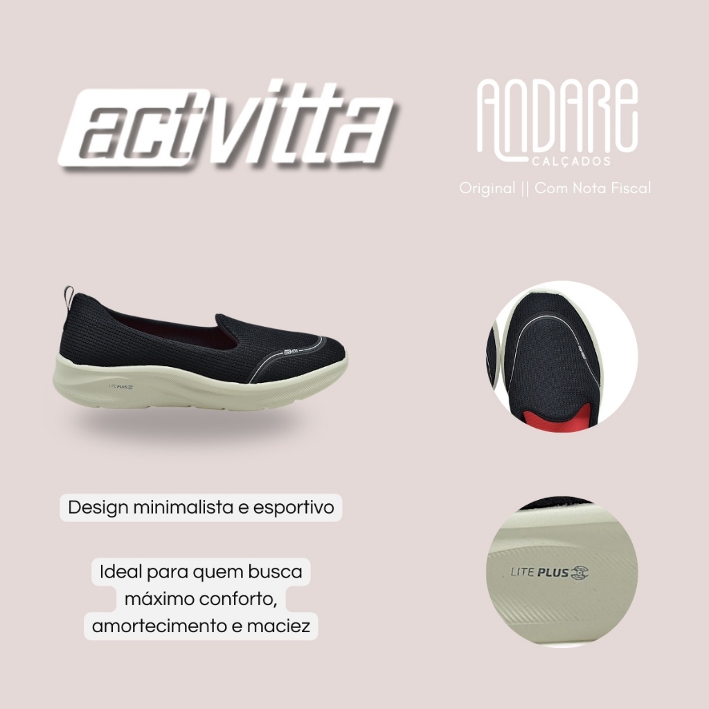 FORMA: Normal (Ver tabela de medidas). MATERIAL: Têxtil de alta qualidade, leve e respirável. CABEDAL: Estrutura minimalista sem cadarços; trama flexível; puxador traseiro. FORRAÇÃO: Totalmente acolchoada em espuma de alta densidade. PALMILHA: Anatômica e acolchoada, com absorção de impacto. SOLA: Tecnologia LitePlus com amortecimento leve; frisos antiderrapantes. CALCE: Slip On, rápido e prático. AJUSTE: Anatômico, firme e confortável. INDICADO PARA: Uso diário, caminhadas leves, rotina dinâmica. ENVIO: Produto novo, original, em caixa protegida com nota fiscal. GARANTIA: 30 dias, contra defeitos de fabricação. O Tênis Slip On Activitta é a escolha perfeita para quem busca praticidade, leveza e conforto absoluto no dia a dia. Com um visual moderno e minimalista, ele foi desenvolvido para acompanhar diferentes rotinas com facilidade, oferecendo um caminhar suave, seguro e cheio de bem-estar. É o tipo de calçado que combina com tudo: desde combinações casuais até produções mais esportivas, sempre entregando suavidade e funcionalidade em cada passo. Confeccionado em material têxtil de alta qualidade, o Slip On Activitta oferece máxima respirabilidade e uma sensação agradável de frescor aos pés. A trama flexível se ajusta naturalmente ao formato do pé, proporcionando liberdade de movimento sem apertar. Além disso, o tecido garante leveza, resistência e um toque macio, mantendo o tênis confortável inclusive em longos períodos de uso. Com design minimalista e linhas limpas, o modelo aposta na simplicidade sofisticada como seu maior diferencial. A ausência de cadarços reforça o visual moderno e funcional, enquanto o cabedal liso se adapta facilmente a qualquer estilo. O puxador traseiro complementa o design e adiciona um elemento prático, tornando o tênis ainda mais versátil e fácil de calçar. O sistema slip on dispensa cadarços, elásticos ou ajustes, proporcionando um calce rápido, simples e confortável. O puxador traseiro facilita ainda mais a colocação do tênis, garantindo agilidade no dia a dia. Seu formato anatômico abraça o pé de maneira natural, oferecendo segurança ao caminhar sem a necessidade de amarrações. O interior é completamente forrado e acolchoado com espuma de alta densidade, proporcionando uma sensação imediata de maciez e proteção. A palmilha anatômica também é acolchoada, garantindo máximo bem-estar, absorção de impacto e conforto prolongado. Cada detalhe do interior foi pensado para proporcionar uma experiência suave, reduzindo o cansaço mesmo após horas de uso. O solado conta com a tecnologia LitePlus, que proporciona amortecimento eficiente, leveza e liberdade total de movimento. Essa tecnologia absorve impactos, suaviza a pisada e garante um caminhar mais fluido. Além disso, os frisos antiderrapantes asseguram aderência e tração em diferentes superfícies, oferecendo segurança e estabilidade em qualquer situação. TABELA DE MEDIDAS Tamanho 34 - 23,7cm Tamanho 35 - 24,3cm Tamanho 36 - 24,9cm Tamanho 37 - 26,1cm Tamanho 38 - 27,4cm Tamanho 39 - 28cm Tamanho 40 - 28,7cm