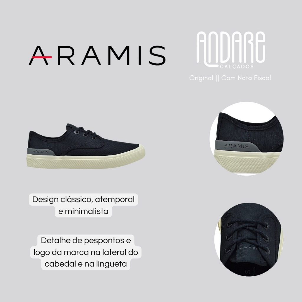 FORMA: Anatômica (ver tabela de medidas) CABEDAL: Lona premium | Costuras reforçadas | Recortes discretos | Logo aplicada em pontos estratégicos PALMILHA: Anatômica acolchoada | Absorção de impactos | Suporte prolongado FECHAMENTO: Cadarço tradicional | Ajuste firme e seguro SOLADO: Borracha de alta resistência | Frisos antiderrapantes para tração e estabilidade INTERIOR: Forro macio | Conforto prolongado | Ventilação adequada ESTILO: Casual moderno | Versátil para produções leves e descontraídas SALTO: Baixo e discreto | Ergonomia e conforto para o dia a dia CONTEÚDO DA CAIXA: 1 par de tênis Aramis Daily Dock Canvas GARANTIA: 30 dias contra defeitos de fabricação ENVIO: Caixa original do fabricante O Tênis Aramis Daily Dock Canvas Masculino é a opção ideal para quem procura praticidade, conforto e um visual moderno para o dia a dia. Com um design versátil e descomplicado, o modelo combina elegância casual e funcionalidade, sendo perfeito para compor produções leves e descontraídas em diversas ocasiões informais. Confeccionado em material têxtil de alta qualidade, o modelo garante resistência, respirabilidade e leveza. A lona premium utilizada na sua estrutura proporciona maior durabilidade, mantendo a forma original mesmo após o uso contínuo, além de oferecer frescor e bem-estar durante todo o dia. O cabedal se destaca pelo design clean e pelos detalhes sutis que reforçam sua autenticidade. Costuras reforçadas, recortes discretos e a aplicação da logo da marca em pontos estratégicos valorizam a estética minimalista do calçado. A combinação entre acabamentos refinados e linhas simples confere ao modelo um estilo atemporal e sofisticado. O fechamento é feito por cadarço de amarrar permitindo um calce ajustado. Sua modelagem anatômica se adapta naturalmente aos pés, oferecendo firmeza e liberdade de movimento sem abrir mão da elegância característica da linha Aramis. No interior, o tênis recebe forro macio que garante conforto prolongado e auxilia na ventilação. A palmilha anatômica e acolchoada foi desenvolvida para oferecer absorção de impactos, suporte e comodidade adicionais, mantendo os pés bem acomodados mesmo em longos períodos de uso. O modelo possui salto baixo e discreto, projetado para equilibrar ergonomia, estilo e praticidade, além de favorecer a postura correta e o uso diário confortável. O solado é confeccionado em borracha de alta qualidade, proporcionando flexibilidade, resistência e excelente aderência. Os frisos estrategicamente posicionados na base garantem tração eficiente em diferentes superfícies, assegurando estabilidade e confiança em cada passo. TABELA DE MEDIDAS Tamanho 38 - 25,5cm Tamanho 39 - 26cm Tamanho 40 - 27cm Tamanho 41 - 27,5cm Tamanho 42 - 28cm Tamanho 43 - 28,5cm Tamanho 44 - 29cm