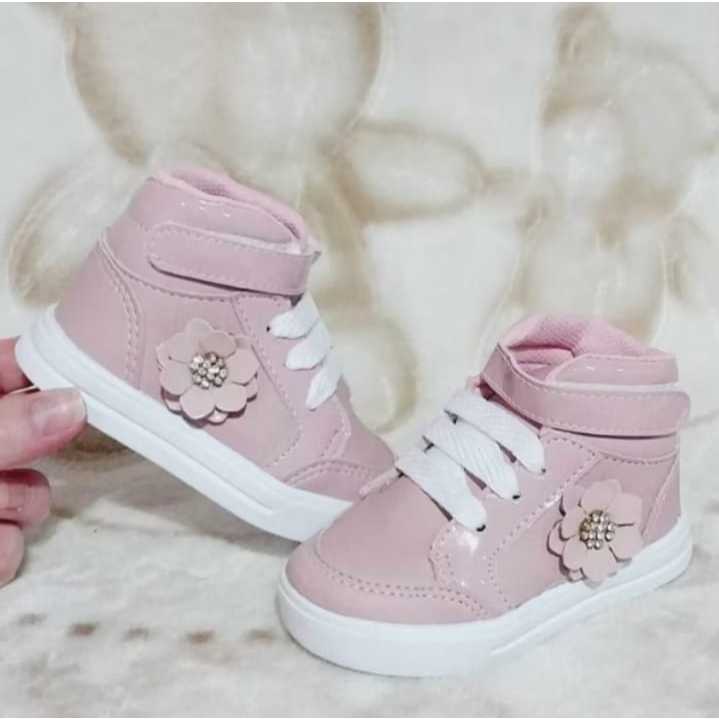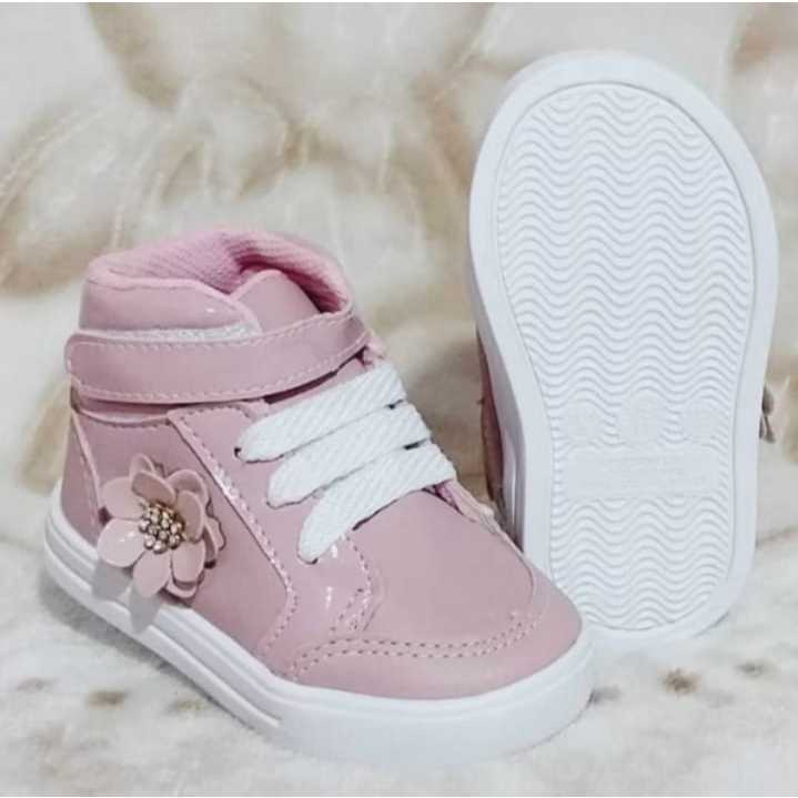 Tenis cano alto estilo botinha rosê com flor menina bebê infantil
