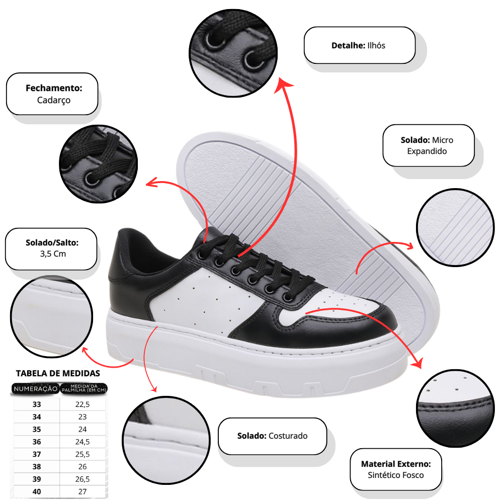 O Tênis Feminino Branco com detalhe é a escolha perfeita para quem busca estilo, conforto e versatilidade em um único calçado. Com design moderno e acabamento sofisticado, ele traz um toque de brilho na medida certa para elevar qualquer look do dia a dia. Produzido em couro sintético de alta qualidade, o modelo combina o clássico branco com o detalhe, garantindo um visual clean, elegante e atual. Ideal para trabalho, passeios, viagens ou eventos casuais, é um verdadeiro curinga no guarda-roupa feminino. O solado plataforma de 5,0 cm oferece leve elevação com conforto, enquanto a palmilha em EVA e o forro interno têxtil proporcionam maciez e bem-estar ao longo do uso. O solado emborrachado antiderrapante garante estabilidade e segurança ao caminhar, e o fechamento em cadarço permite ajuste firme aos pés. Combina perfeitamente com vestidos casuais, saias midi, jeans, pantacourt ou conjuntos modernos, trazendo praticidade e sofisticação em cada passo. 👟 CARACTERÍSTICAS DO PRODUTO Material Externo: Sintético Material Interno: Têxtil Palmilha: EVA Solado: Emborrachado antiderrapante Altura do Solado: 5,0 cm Fechamento: Cadarço Detalhe: Moderno Estilo: Casual | Urbano | Moderno 📏 TABELA DE MEDIDAS – PALMILHA (cm) 33 – 22,5 34 – 23,0 35 – 24,0 36 – 24,5 37 – 25,0 38 – 25,0 39 – 26,5 40 – 27,0 ✔️ Forma normal – recomendamos escolher a mesma numeração que você já utiliza.