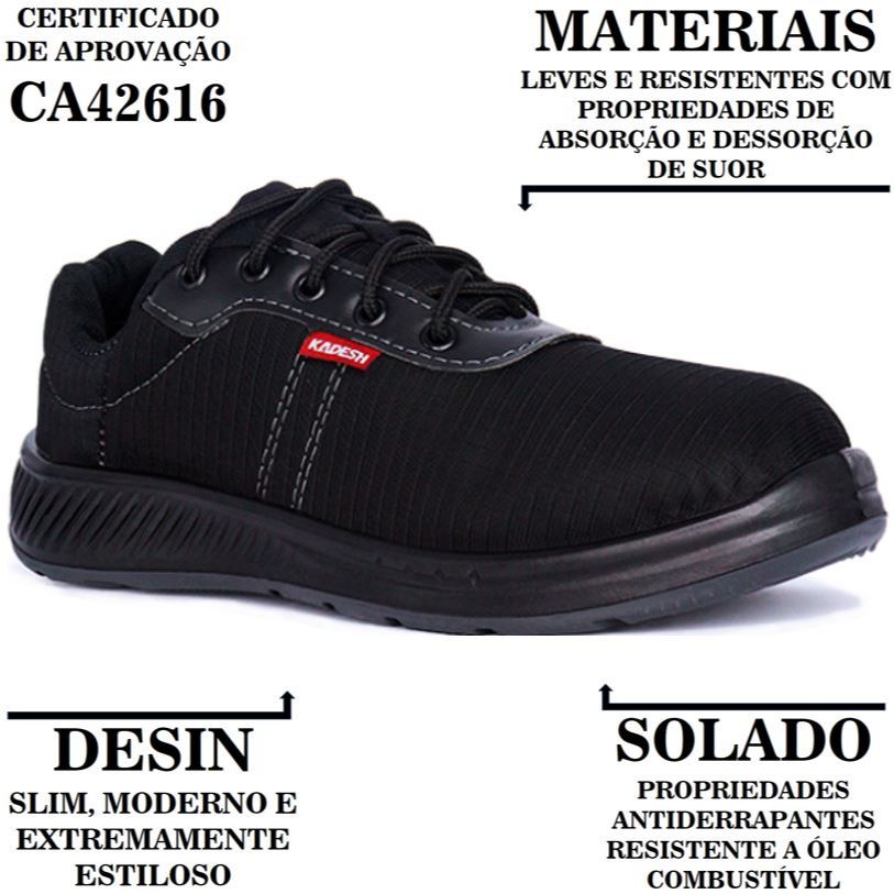 Tênis de Amarrar Preto Kadesh CA42616 Moderno, Leve, Bonito, Confortável, Resistente, Unisex, Transpirável, BIco de PVC.