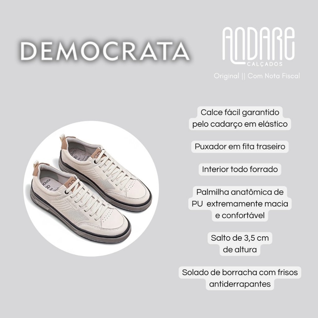 FORMA: Normal (Ver tabela de medidas) CABEDAL: Couro PALMILHA: Anatômica em PU FECHAMENTO: Cadarço ALTURA DO SOLADO: 3.5cm SOLADO: TPU | Antiderrapante ENVIO: Na caixa do fabricante GARANTIA: Contra defeitos de fabricação - 30 dias O Tênis Denim Dylan em Couro Democrata é a escolha ideal para quem busca unir estilo, conforto e qualidade em um só produto. Com um visual contemporâneo e versátil, este modelo é perfeito para complementar as mais variadas produções, transitando com facilidade entre ocasiões casuais e momentos que exigem um toque de elegância. Confeccionado em couro legítimo de alta qualidade, o Tênis Democrata destaca-se pela excelência de seus materiais e acabamento primoroso. O couro nobre utilizado em sua produção proporciona um aspecto refinado e resistente, garantindo não apenas um visual sofisticado, mas também uma durabilidade superior, que acompanha você por muito mais tempo sem perder sua elegância original. Seu cabedal foi cuidadosamente desenvolvido para transmitir um visual elegante e rico em detalhes. Com recortes estratégicos no couro, pespontos reforçados e a aplicação discreta da logo Democrata na lateral, na lingueta e no solado, o design do Denim Dylan é pensado para quem aprecia a estética clean e valorizada nos mínimos detalhes. Um modelo que une tradição e modernidade de forma harmônica, sem excessos. O fechamento em cadarço de elástico assegura um ajuste perfeito aos pés e maior praticidade, permitindo um calce personalizado e firme. Para facilitar ainda mais o uso no dia a dia, o modelo conta com um prático puxador em fita na parte traseira, auxiliando na hora de calçar e tornando o tênis ainda mais funcional, sem comprometer o visual sofisticado. Pensando no máximo conforto para o usuário, o Tênis Denim Dylan apresenta uma palmilha anatômica em PU, extremamente macia, que se adapta aos contornos dos pés e proporciona uma sensação única de bem-estar a cada passo. Seu interior é totalmente forrado com material têxtil de alta qualidade, garantindo não apenas suavidade no contato com a pele, mas também maior respirabilidade, ideal para o uso prolongado. O salto flatform do modelo possui altura de 3,5 cm, proporcionando estabilidade e um leve ganho de altura sem abrir mão do conforto. Essa estrutura plana e levemente elevada distribui o peso de maneira equilibrada, conferindo ao calçado um visual moderno e ao mesmo tempo extremamente confortável para diversas ocasiões. Finalizando com excelência, o solado é confeccionado em borracha resistente, com frisos antiderrapantes que asseguram máxima aderência e segurança ao caminhar. Além disso, sua estrutura flexível permite movimentos naturais, oferecendo mais liberdade e estabilidade em cada passo, seja em pisos lisos ou em superfícies irregulares. TABELA DE MEDIDAS Tamanho 37 - 26.7cm Tamanho 38 - 27cm Tamanho 39 - 28cm Tamanho 40 - 28.4cm Tamanho 41 - 29.1cm Tamanho 42 - 29.8cm Tamanho 43 - 30.5cm Tamanho 44 - 31cm