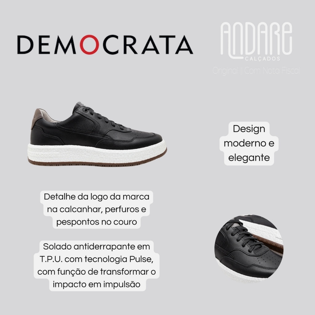 FORMA: Normal (ver tabela de medidas) CABEDAL: Couro FECHAMENTO: Cadarço, Amarrar PALMILHA: P.U. FORRO: Tecido SOLADO: EVA ENVIO: Na caixa do fabricante O Tênis Denim Drake Pulse Democrata é uma síntese perfeita de estilo, conforto e durabilidade. Projetado para os homens que buscam uma combinação entre elegância urbana e funcionalidade, este calçado é uma escolha excepcional para diversas ocasiões. Confeccionado em couro de alta qualidade, o Tênis Denim Drake Pulse exibe uma estética moderna e sofisticada, com detalhes cuidadosamente trabalhados que ressaltam sua qualidade artesanal. O couro macio oferece não apenas um visual elegante, mas também uma sensação luxuosa ao toque, garantindo conforto durante todo o dia. O design contemporâneo do tênis é complementado por elementos sutis, como costuras constrastantes, detalhe da logo da marca no calcanhar, perfuros e pespontos no couro, conferindo um toque de sofisticação ao calçado. O modelo conta com fechamento por cadarço de amarrar, garantindo um calce prático, fácil e super ajustado conforme preferência. Além de sua estética impressionante, o Tênis Denim Drake Pulse prioriza o conforto e o desempenho. Sua palmilha feita de P.U. proporciona suporte adicional aos pés, garantindo máximo conforto e bem estar. Seu solado é todo confeccionado em T.P.U com tecnologia Pulse, que tem a função de transformar o impacto em impulso, aliviando a pressão nos pés e articulações, tornando o caminhar mais eficiente e confortável. Além disso, conta com frisos antiderrapantes, oferecendo tração e estabilidade em uma variedade de superfícies, garatindo maior segurança a cada passo. TABELA DE MEDIDAS Tamanho 37 - 25.5cm Tamanho 38 - 26cm Tamanho 39 - 27cm Tamanho 40 - 27.5cm Tamanho 41 - 28cm Tamanho 42 - 29cm Tamanho 43 - 29.5cm Tamanho 44 - 30cm