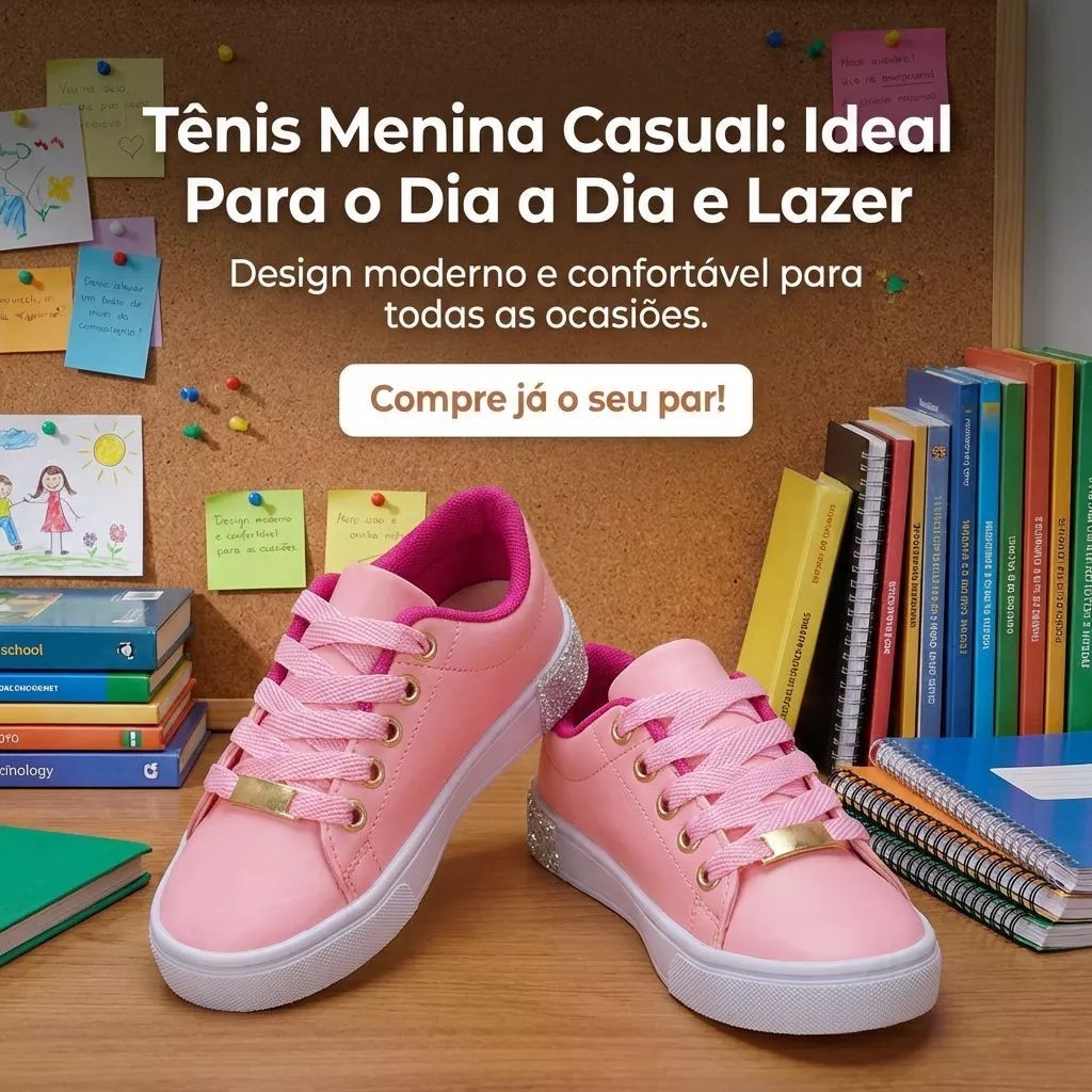 Tênis Infantil Colegial Feminino – O favorito de toda menina! Um item que não pode faltar no guarda-roupa da sua pequena! Esse Tênis Infantil Feminino Colegial é a combinação perfeita de praticidade, conforto e estilo para o dia a dia. Seja para ir à escola, passear ou brincar, ele é ideal para acompanhar as aventuras das nossas princesas com muita segurança e um toque fashion que elas adoram! Por que as mamães escolhem esse tênis? Conforto garantido: Feito com material leve e macio, perfeito para os pezinhos ficarem felizes o dia todo! Segurança em cada passo: Solado antiderrapante em micro expandido, para elas correrem e pularem sem preocupação! ️ Estilo versátil: Combina com tudo – shorts, saias, vestidos, calças ou bermudas – deixando sua filha sempre linda! Charme especial: Detalhe de glitter brilhante prata no solado, super na moda, que dá um brilho mágico ao look! Detalhes do produto: ️ Cabedal: Sintético de alta qualidade, resistente e fácil de limpar. Solado: Micro expandido, leve e com aderência extra. Tamanhos da palmilha (medida interna): 25 – 17,5 cm 26 – 18 cm 27 – 19 cm 28 – 19,5 cm 29 – 20 cm 30 – 20,5 cm 31 – 21,5 cm 32 – 22 cm 33 – 22,5 cm 34 – 23 cm 35 – 24 cm 36 – 24,5 cm Dica especial para mamães: Meça o pezinho da sua filha com uma régua para acertar no tamanho e garantir o conforto perfeito! Alguma dúvida? É só chamar no chat da loja – estamos aqui para ajudar você a escolher o melhor para sua pequena estrela!