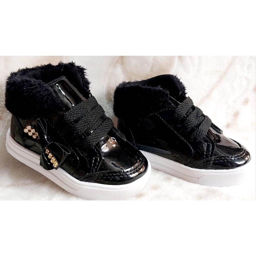 tênis estilo botinha preta verniz com laço menina infantil bebê promoção