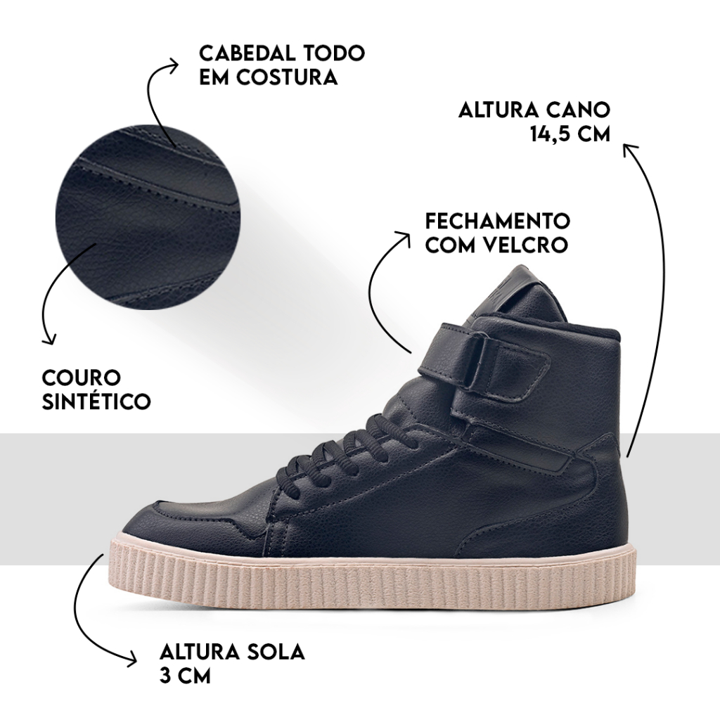 Este tênis de cano alto é uma escolha estilosa e confortável para ocasiões casuais e esportivas. Com um design moderno e minimalista, ele é ideal para quem busca um visual limpo e sofisticado. CARACTERISTICAS: -O cabedal é confeccionado em couro sintético e nylon, proporcionando durabilidade e resistência, além de um acabamento estético de alta qualidade. -O solado é feito de EVA, material conhecido por sua leveza e flexibilidade, proporcionando uma caminhada mais confortável e segura. -A palmilha é de EVA com 5mm de espessura, oferecendo amortecimento adicional e suporte ao arco do pé. -A forração interna é feita de tecido, oferecendo conforto e respirabilidade aos pés durante o uso prolongado. TABELA DE MEDIDAS Nº Comprimento Palmilha 34 24 cm 35 24,5 cm 36 25 cm 37 25,5 cm 38 26,0 cm 39 26,5 cm 40 27 cm * O ajuste da forma é maior* PERGUNTAS FREQUENTES: 1- Como devo limpar este tênis? Para limpar o cabedal de couro sintético, utilize um pano úmido com sabão neutro. Evite imergir o tênis na água. A forração interna pode ser higienizada com um pano levemente umedecido. 2- O tênis é resistente à água? O couro sintético oferece alguma resistência à água, mas o tênis não é à prova d'água. Evite usar em condições de muita umidade ou chuva intensa. 3- Este tênis é adequado para atividades esportivas? Este tênis é ideal para uso casual, caminhadas leves e musculação 4 - O couro sintético é durável? Sim, o couro sintético utilizado neste tênis é de alta qualidade, garantindo durabilidade e resistência ao desgaste do uso cotidiano. Ficou com alguma dúvida? Será um prazer te atender no nosso chat.