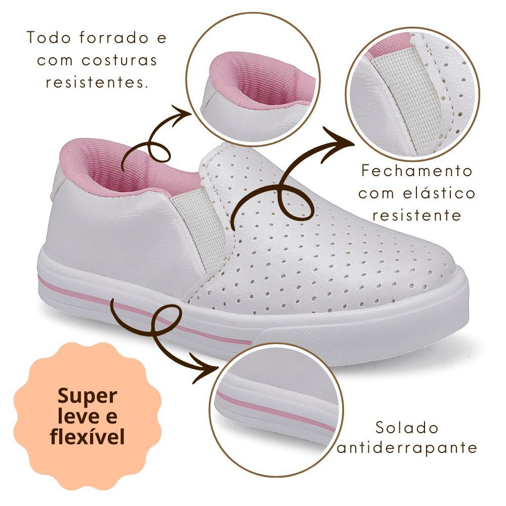 Conforto, estilo e praticidade para os pezinhos da sua pequena fashionista! O Tênis Feminino Infantil Slip On da Pequito é aquele item que não pode faltar no guarda-roupa das crianças que adoram estar bem vestidas em qualquer ocasião. Com um design moderno e cheio de charme, ele está disponível nas cores dourado, branco perolizado e chumbo, ideais para quem ama brilho na medida certa. Produzido em material sintético de alta qualidade, esse modelo é super resistente, durável e fácil de higienizar, perfeito para o dia a dia agitado das crianças. A parte frontal conta com textura perfurada que garante ainda mais estilo, além de permitir melhor ventilação interna. Destaques do produto: Cores: Branco com forro rosa. Textura perfurada com furinhos estilosos; Elásticos laterais reforçados (não esgarçam); Fácil de calçar: modelo slip-on que promove autonomia; Interior todo forrado com espumas macias, oferecendo aconchego e conforto extra; Palmilha fofinha e anatômica; Solado antiderrapante e flexível, com ótima aderência; Recortes perfeitos e acabamento refinado. Ideal para combinar com vestidos, calças, shorts ou até mesmo uniformes, o modelo une estilo e conforto em um só calçado. É a escolha certa para crianças que querem se destacar com muito charme e liberdade! Numeração: 20 ao 34. Cores: Dourado, perolizado e chumbo. Como medir o pé da criança: Selecione com atenção a cor e tamanho correspondentes com a medida do pé da criança. É importante estar com as medidas certas para realizar a compra, evitando trocas e devoluções. Passo 1: Coloque o pé da criança sobre uma folha de papel, em uma superfície reta. Passo 2: Marque o calcanhar e a ponta do dedão com um risco. Use a régua ou fita métrica para medir a distância entre as duas marcas e descubra a medida em centímetros do pé. Lembre-se que a medição começa a partir do número 0. A seguir, observe na tabela de medidas o número que mais se aproxima da quantidade de centímetros do pé da criança. Comparar com a tabela disponível. 20. 13.7 cm 21. 14.3 cm 22. 15 cm 23. 15.7 cm 24. 16.3 cm 25. 17 cm 26. 17.7 cm 27. 18.3 cm 28. 19 cm 29. 19.7 cm 30. 20.3 cm 31. 21 cm 32. 21.6 cm 33. 22.3 cm 34. 23 cm Tênis Feminino Infantil Slip On Metalizado Pérola - Características Gerais do Produto: • Faixa Etária: Pré Infantil - até 6 anos (20 ao 27); Infantil - até 7 anos (23 ao 32); Kids - até 10 anos (28 ao 36) • Gênero: Menina • Material Externo: Sintético • Cor: Prata • Solado: Emborrachado antiderrapante • Limpeza e Conservação: Lavagem manual. Não utilizar escova, detergentes ou solventes. Evitar molho e secar a sombra. • Tabela de Medidas: img/2025/03/produto/3560/723401-3.jpg Acompanha o produto: • 1 Par de Tênis • Caixa de Papelão Garantia: • Garantia de Fábrica