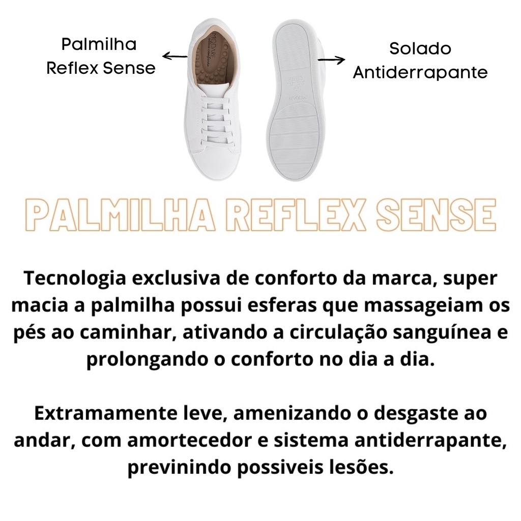 TENIS FEMININO CASUAL ORTOPEDICO MODARE 7363.105 MASSAGEADOR ESPORAO - Todos os nossos produtos são originais e acompanham nota fiscal - - Enviamos seu pedido em até 24h úteis - Com design minimalista e casual, este modelo esconde um atributo que todas as mulheres que sentem dores nos pés desejam: uma palmilha massageadora. Com a tecnologia Reflex Sense, que possui esferas que massageiam os pés ao caminhar, ativando a circulação sanguínea e prolongando o conforto no dia a dia; ainda conta com o sistema de amortecimento, que absorve até 80% do impacto da pisada ao caminhar, amenizando o desgaste; e por fim e não menos importante, possui um solado antiderrapante, capaz de prevenir possíveis lesões. TABELA DE MEDIDAS Nº 34 = 24 CM Nº 35 = 24,5 CM Nº 36 = 25 CM Nº 37 = 25,5 CM Nº 38 = 26 CM Nº 39 = 26,5 CM