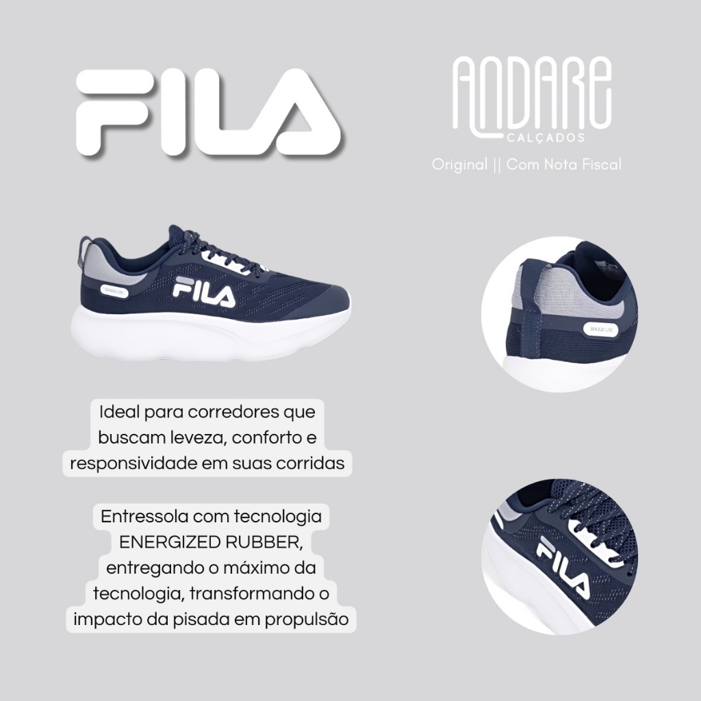 FORMA: Normal (Ver tabela de medidas) CABEDAL: Mesh (Tecido resistente e respirável) PALMILHA: 100% - EVA FORRO: 100% Têxtil FECHAMENTO: Cadarço ENTRESOLA: ENERGIZED RUBBER SOLADO: Borracha Grip ENVIO: Na caixa do fabricante Ideal para quem busca um tênis leve, confortável e eficiente para a rotina de treinos ou caminhadas, o Tênis Fila Maxxi Lite se destaca por unir alta performance com tecnologia de ponta. Desenvolvido especialmente para corredores que desejam responsividade e estabilidade, ele é indicado tanto para iniciantes quanto para atletas experientes. Um modelo versátil que entrega conforto desde a primeira passada até os quilômetros finais. Sua confecção é baseada em materiais têxteis de alta qualidade, com cabedal em mesh respirável, que oferece excelente ventilação, leveza e resistência. Essa estrutura permite que o pé se mantenha seco e arejado, mesmo em treinos mais longos ou dias mais quentes. A leveza proporcionada pelo mesh reduz a fadiga, favorecendo a performance e permitindo um uso prolongado com conforto. O sistema de fechamento é feito por cadarço de amarrar, o que permite um calce totalmente personalizado e ajustado ao formato do pé. Esse tipo de amarração proporciona segurança extra e maior estabilidade, permitindo que o tênis se mantenha firme nos pés mesmo em atividades com maior intensidade ou variação de ritmo. No interior do calçado, o conforto continua sendo prioridade. A palmilha anatômica em EVA, forrada com tecido poliéster, se adapta à anatomia do pé, oferecendo maciez e suporte a cada passada. O interior acolchoado evita atritos, garantindo uma experiência de uso agradável tanto para corridas leves quanto para longas caminhadas. A entressola é equipada com a avançada tecnologia ENERGIZED RUBBER, um dos grandes destaques do Maxxi Lite. Essa tecnologia transforma o impacto da pisada em energia de propulsão, resultando em uma passada mais eficiente, responsiva e fluida. O amortecimento equilibrado favorece o desempenho e oferece proteção às articulações, tornando o modelo ideal para treinos diários. Já o solado é confeccionado em borracha com grip estratégico, oferecendo excelente aderência e estabilidade em diferentes tipos de solo. Essa estrutura proporciona segurança e firmeza a cada passo, mesmo em pisos mais escorregadios, garantindo uma passada confiante em qualquer ambiente. O Tênis Fila Maxxi Lite é a fusão perfeita entre leveza, tecnologia e conforto. Um modelo feito para acompanhar seu ritmo, seja nas corridas leves, nos treinos de ritmo ou nas caminhadas do dia a dia. TABELA DE MEDIDAS Tamanho 37 - 26.5cm Tamanho 38 - 27cm Tamanho 39 - 27.3cm Tamanho 40 - 28cm Tamanho 41 - 28.8cm Tamanho 42 - 29.7cm Tamanho 43 - 30.6cm Tamanho 44 - 31.5cm