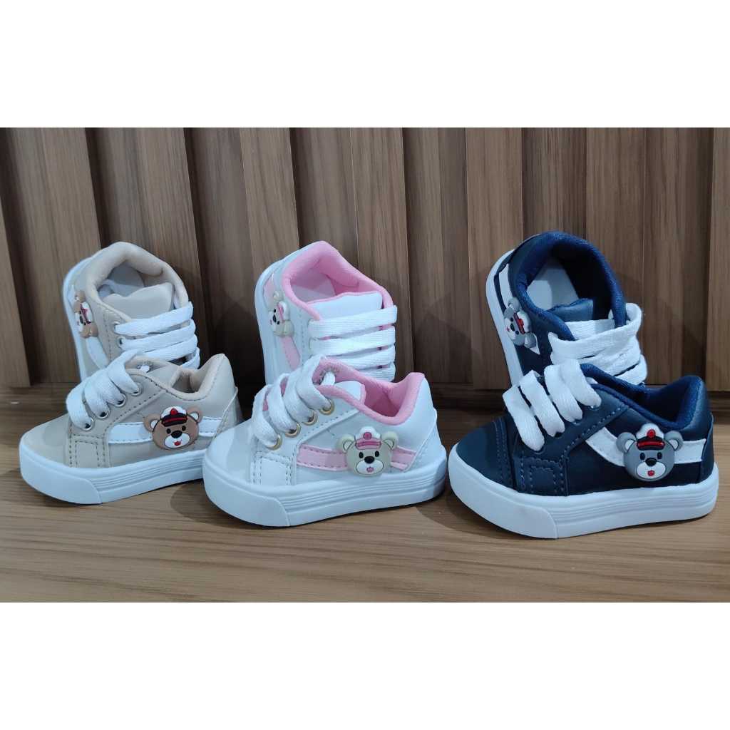 Tênis infantil de bebe bege azul ou rosa com detalhe branco enfeite urso marinheiro estiloso casual menino ou menina