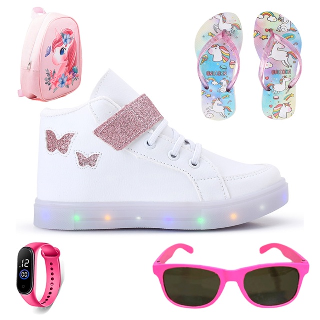 Tenis Infantil De Led Meninas Botinha Borboleta + Mochila + Chinelo + Oculos + Relogio