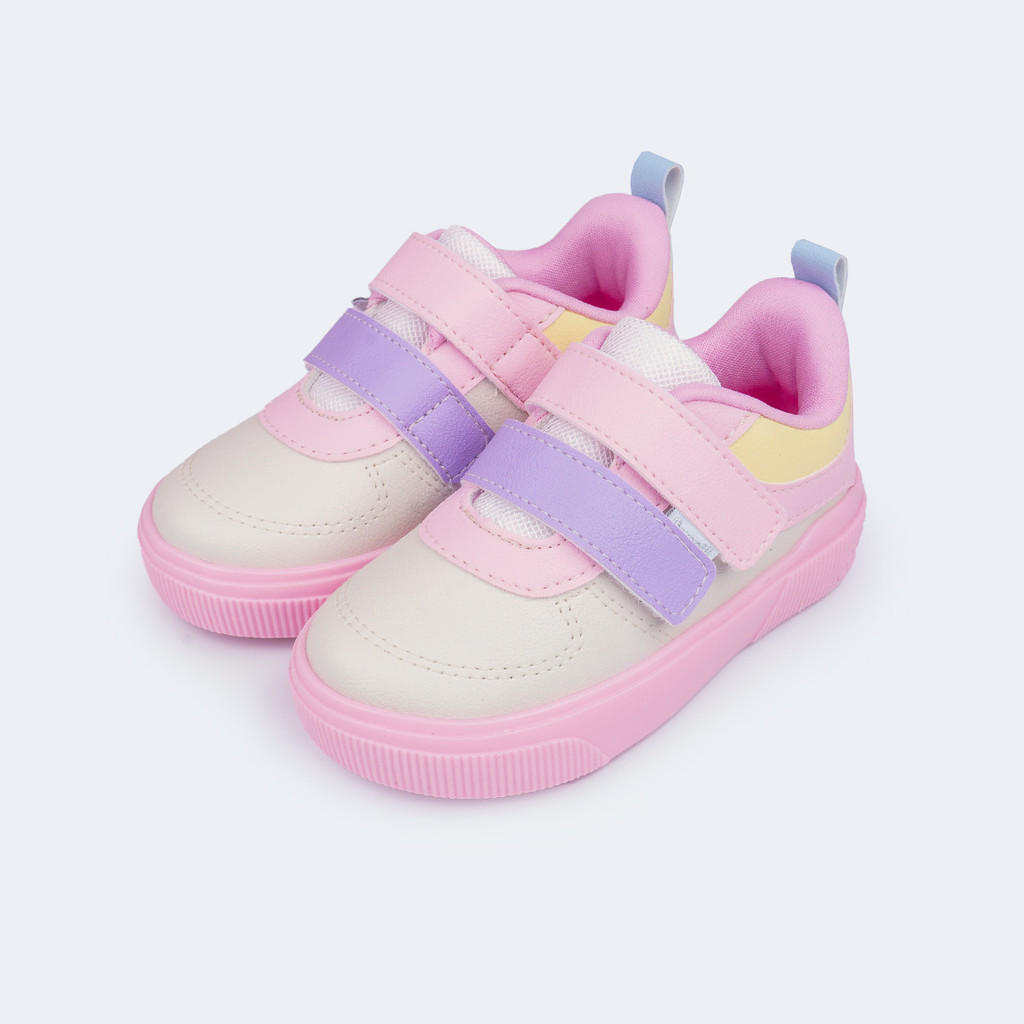 Tênis feminino em sintético na cor branca com recortes em tons rosados, fofo e atemporal para a menina usar no dia a dia e na escola! Tênis infantil com forro interno que auxilia na absorção do suor e colarinho super comfy, para maior conforto ao caminhar. Palmilha anatômica, com a densidade ideal para os pés, minimizando impactos. Tênis com calce fácil, fechamento em fita aderente, dando autonomia e praticidade para o dia a dia. Tênis de solado caixa alta, emborrachado ecológico e antiderrapante, formando desenhos de flores. O solado possuí escrita em braile indicando o lado direito e esquerdo para meninas cegas ou com baixa visão! Aposte!Tênis infantil feminino casual para usar no dia a dia! Modelo e cores clássicas, perfeito para combinar com vários looks. Monte um look completo com roupa infantil feminina, clicando aqui!Clique aqui e fique por dentro das novidades e tendências do Mundo da Menina!