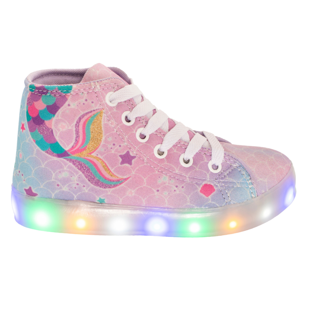 Tênis Infantil Led Feminino Sereia Cano Alto Botinha + Óculos Relógio Pulseira Paleta